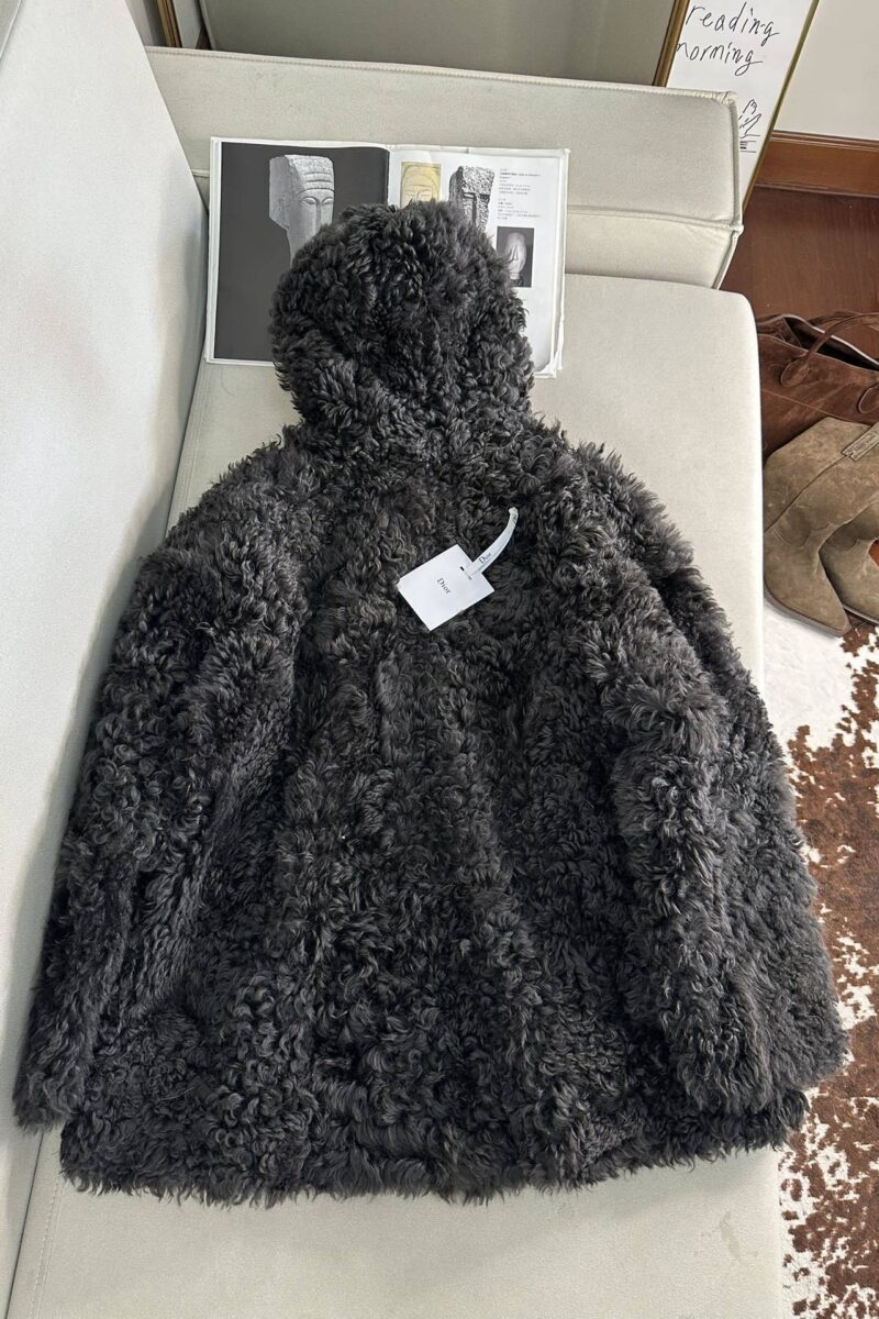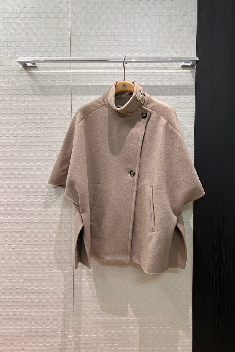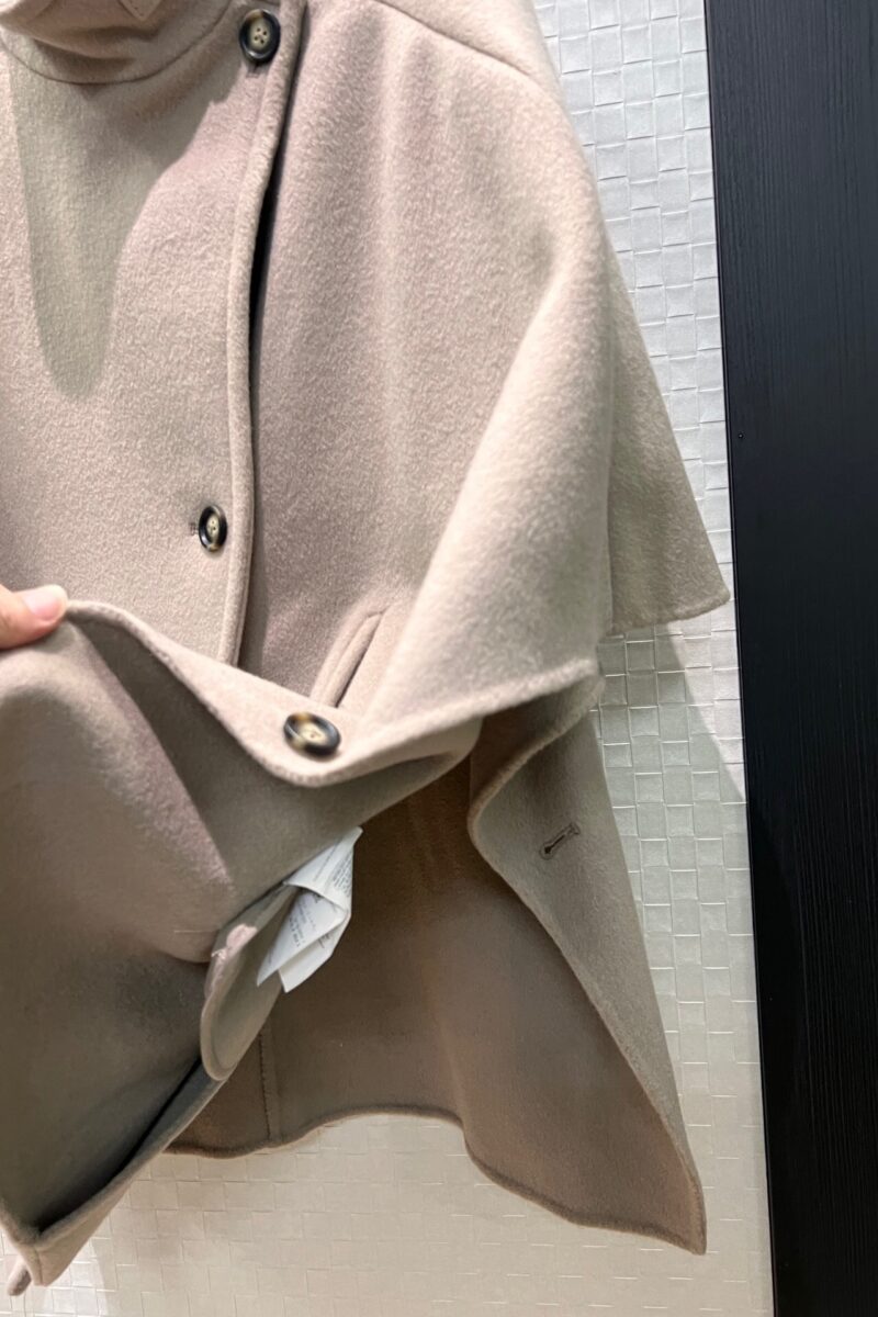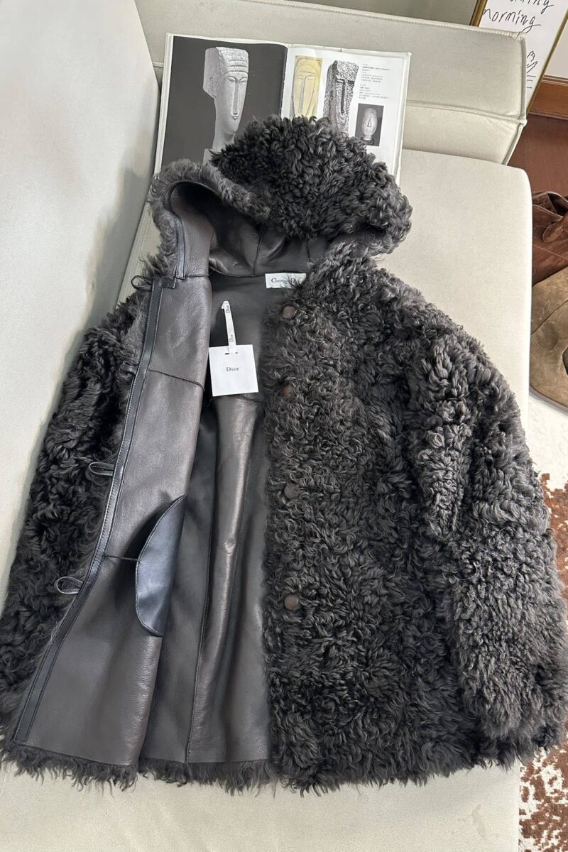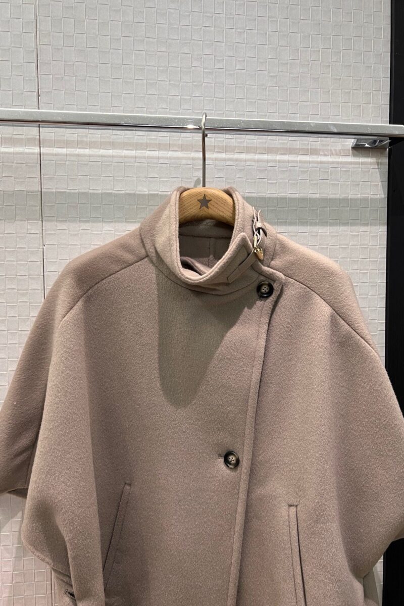 Manteau ceinturé laine & cachemire, col shearling beige grège