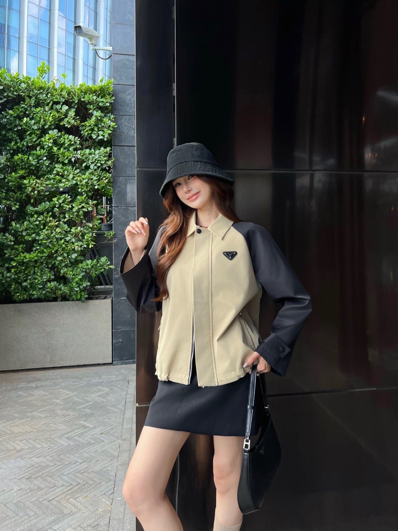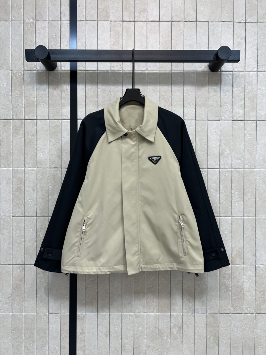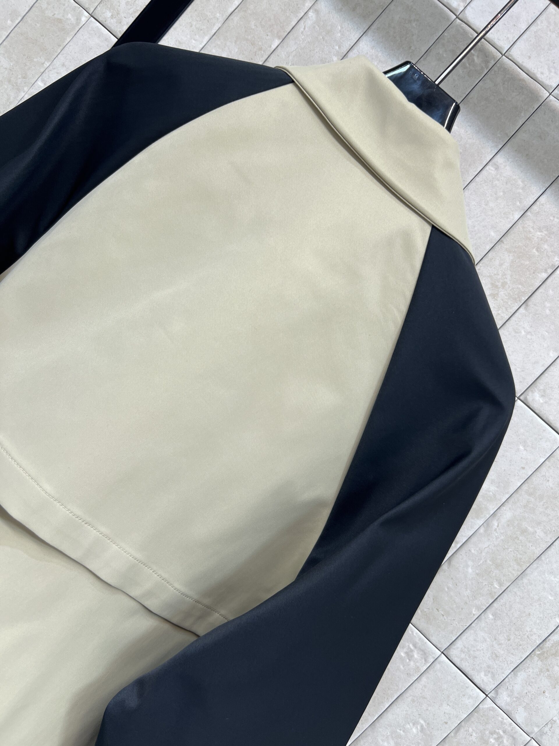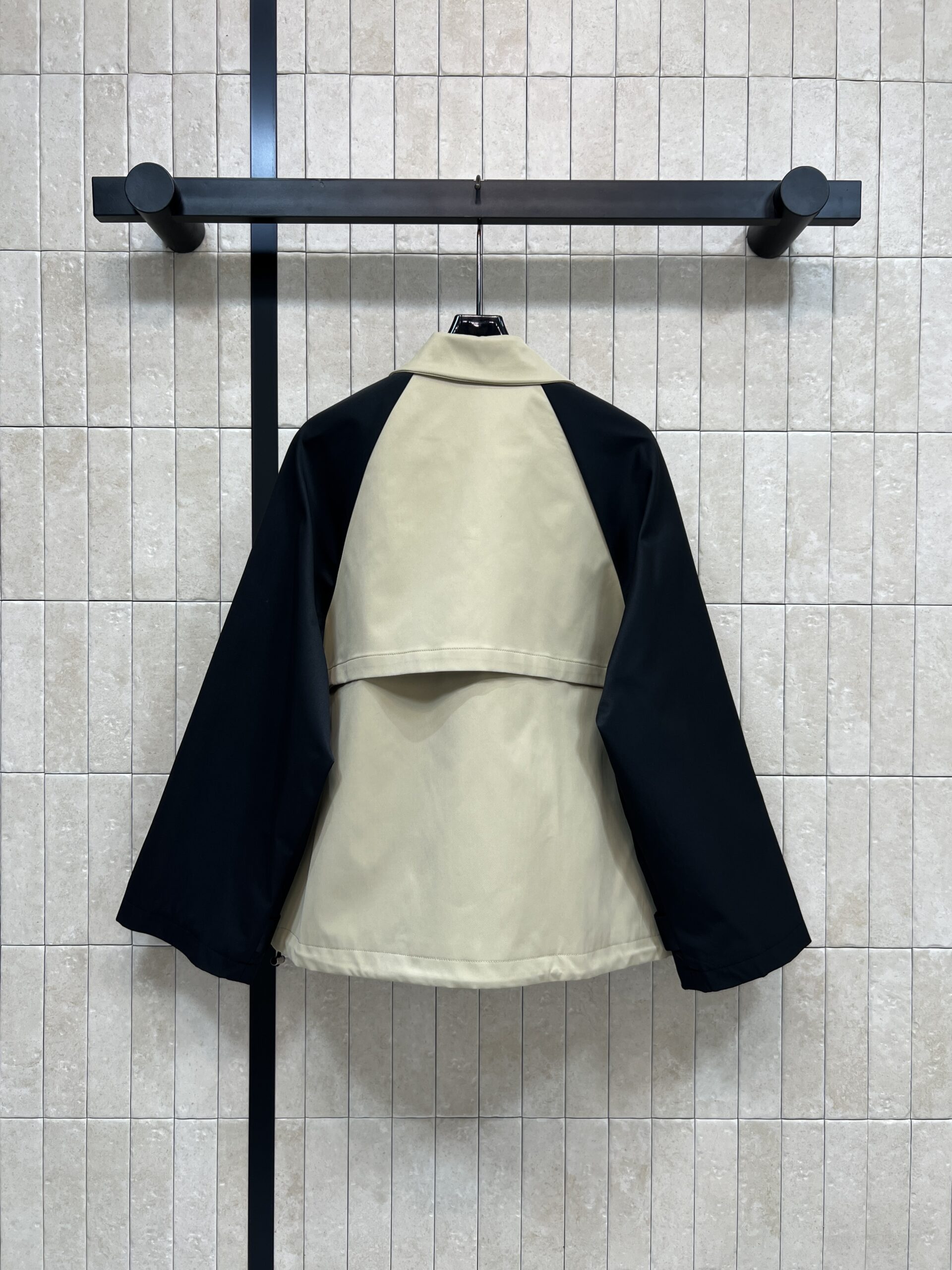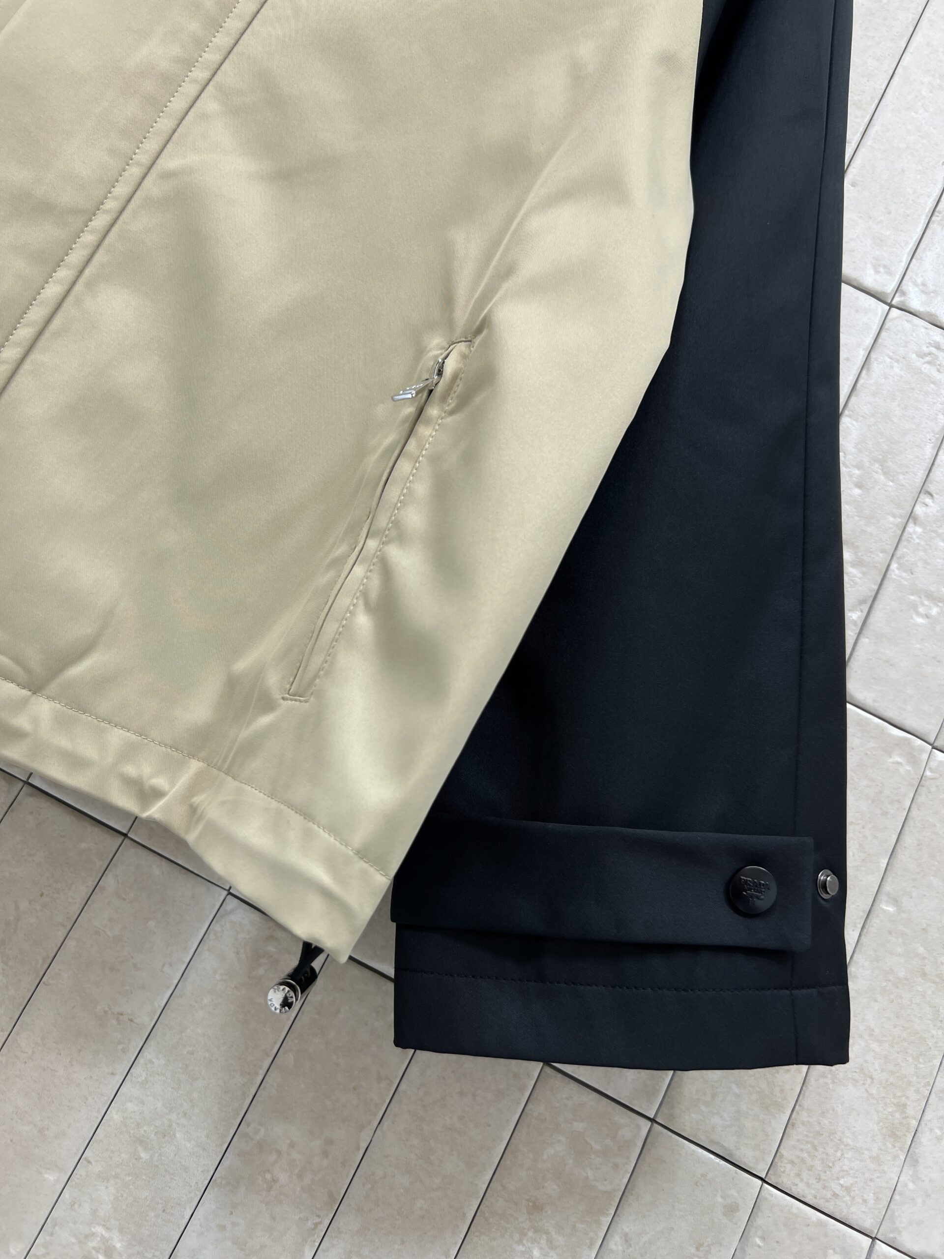 • Design Bicolore : Le corps de la veste est beige, tandis que les manches raglan sont d’un noir profond pour un effet graphique.