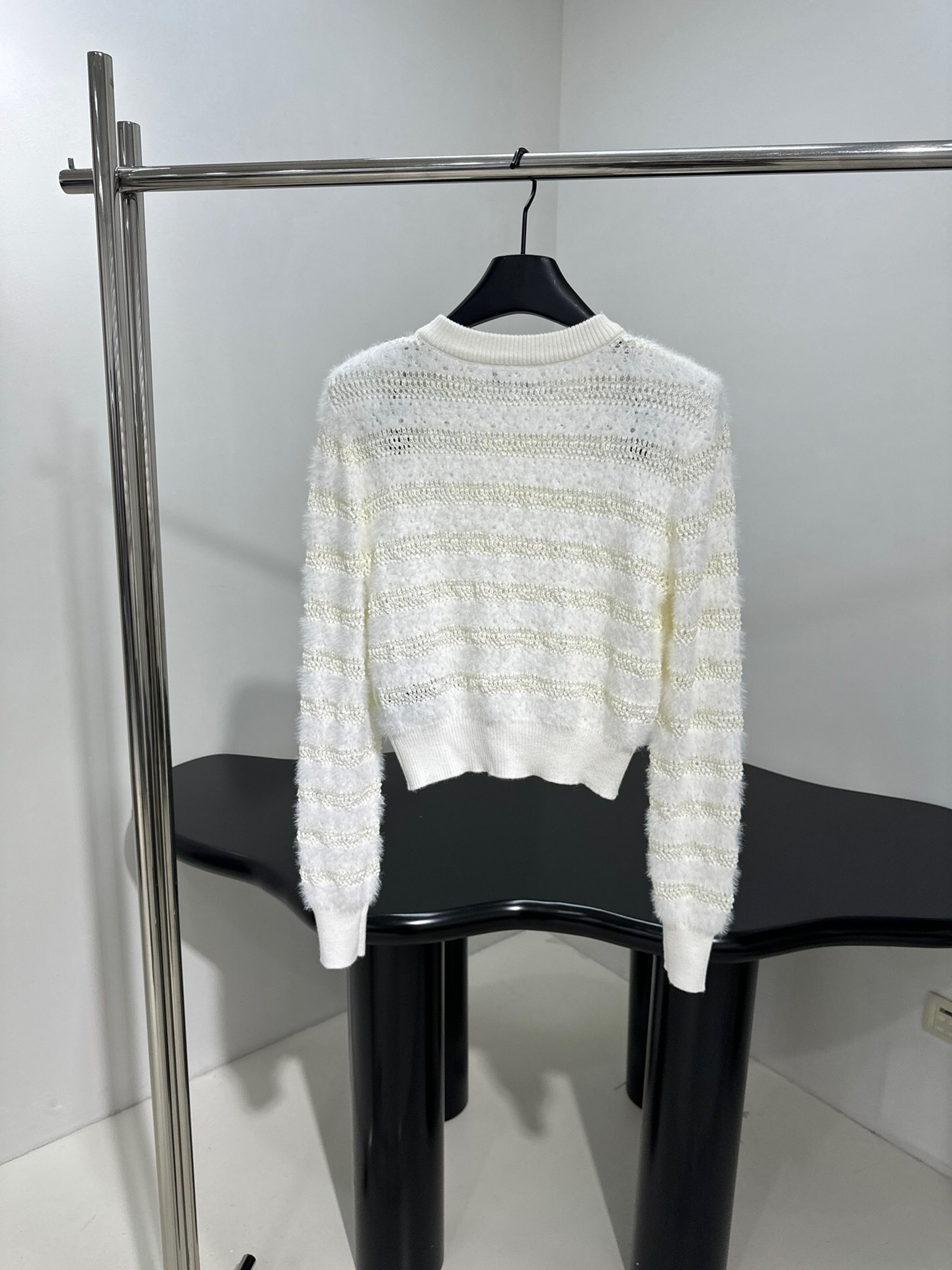 Adoptez une allure raffinée avec ce cardigan blanc unique. Il se distingue par son jeu de textures, alternant des rayures duveteuses et une maille ajourée pour un effet visuel riche et délicat. C’est la pièce parfaite pour superposer avec élégance.