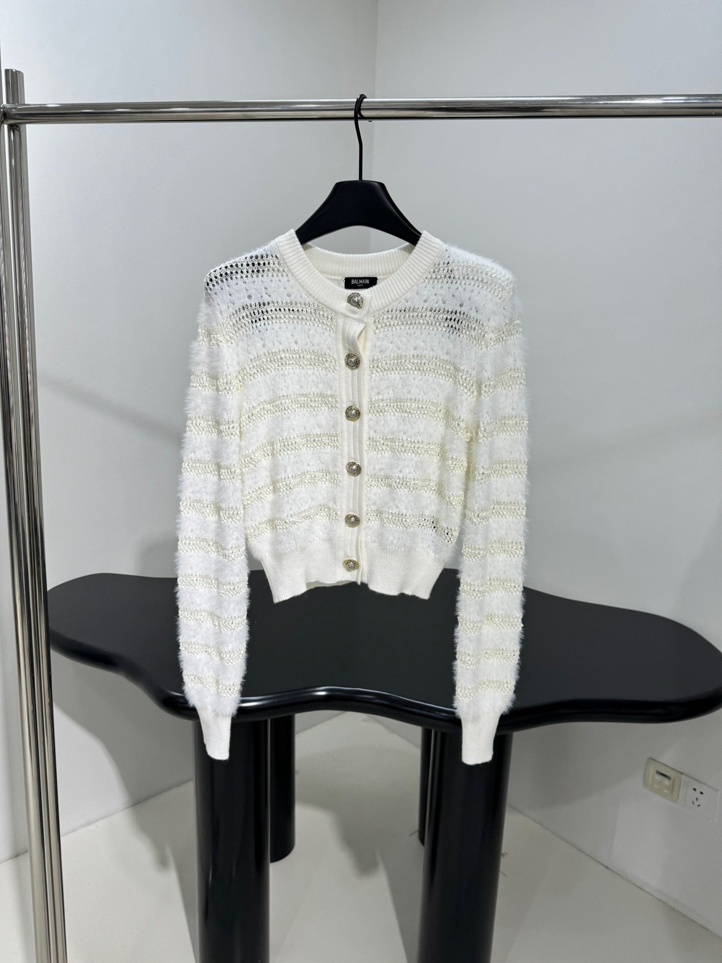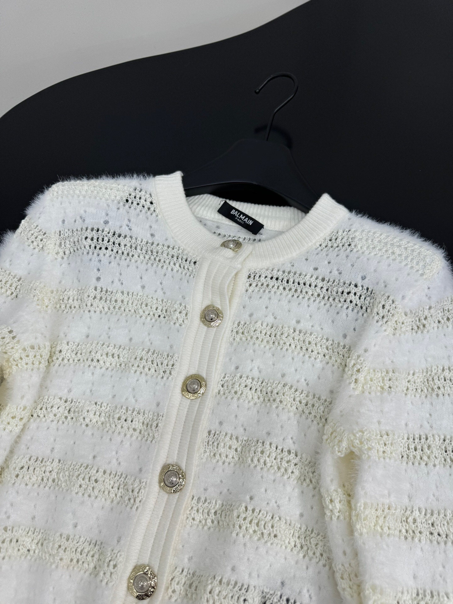 Un cardigan blanc doux et texturé, parfait pour une touche de sophistication. Ses rayures duveteuses et sa maille ajourée créent un look à la fois délicat et moderne.