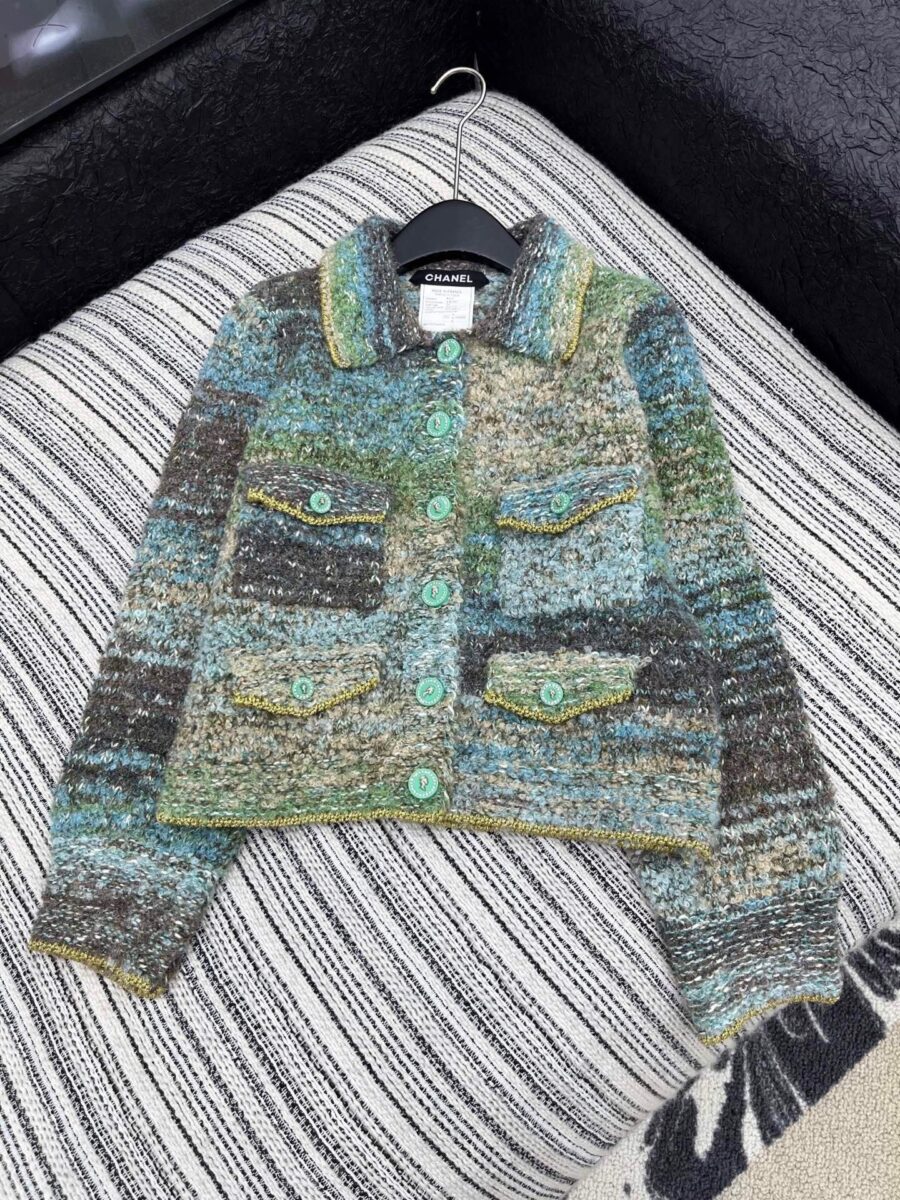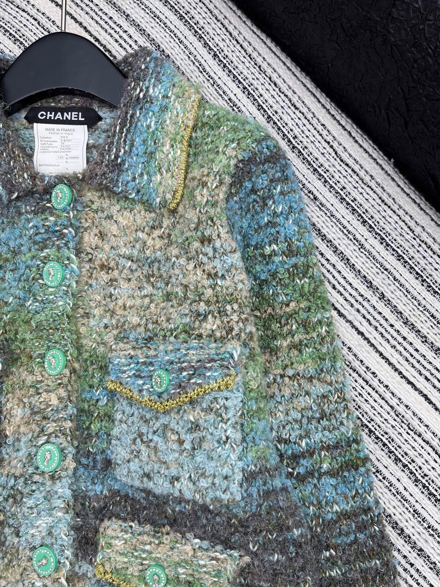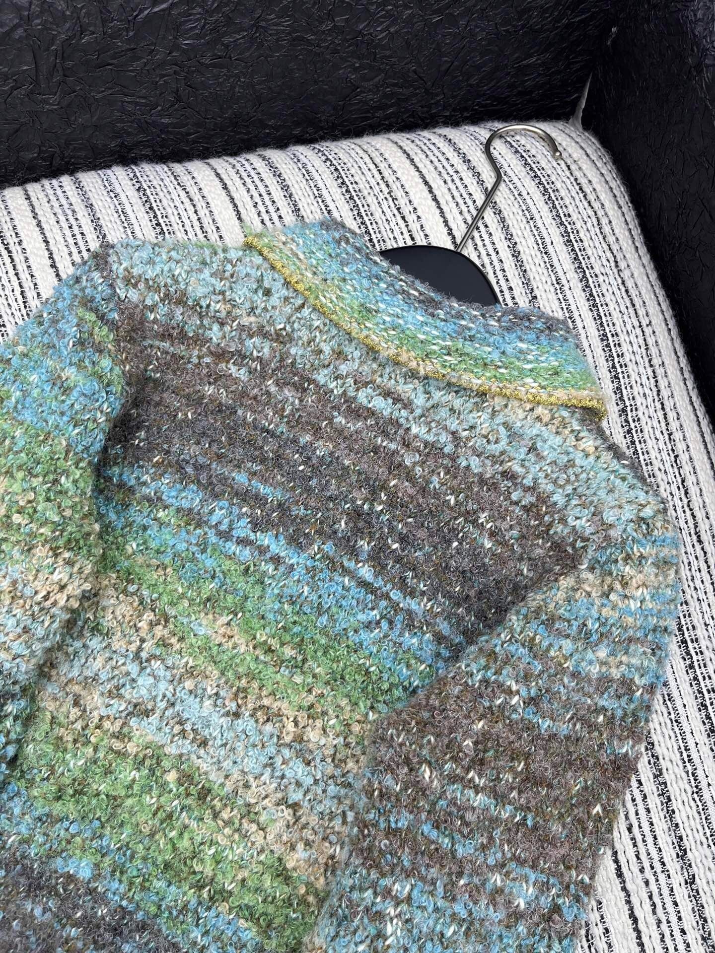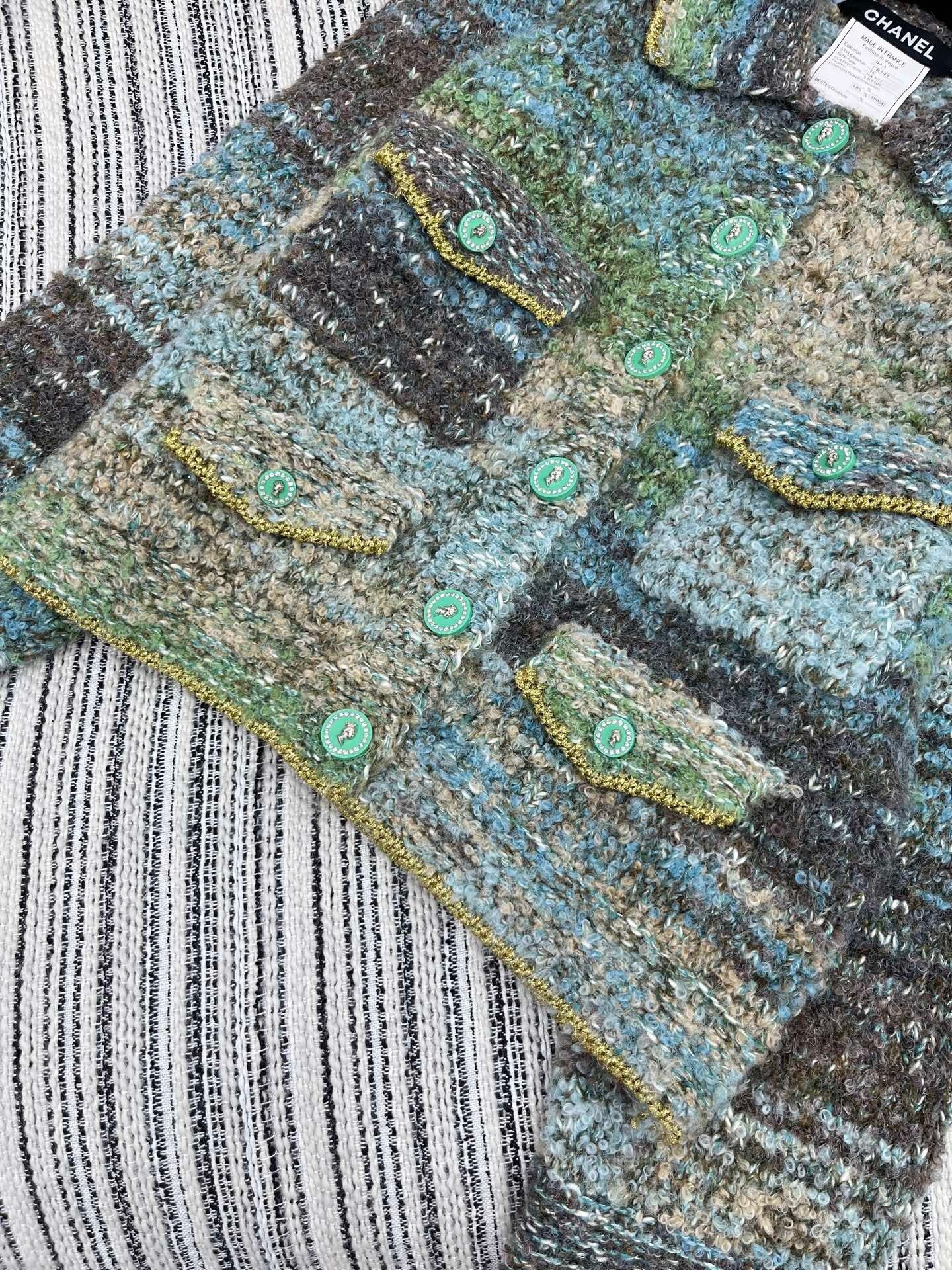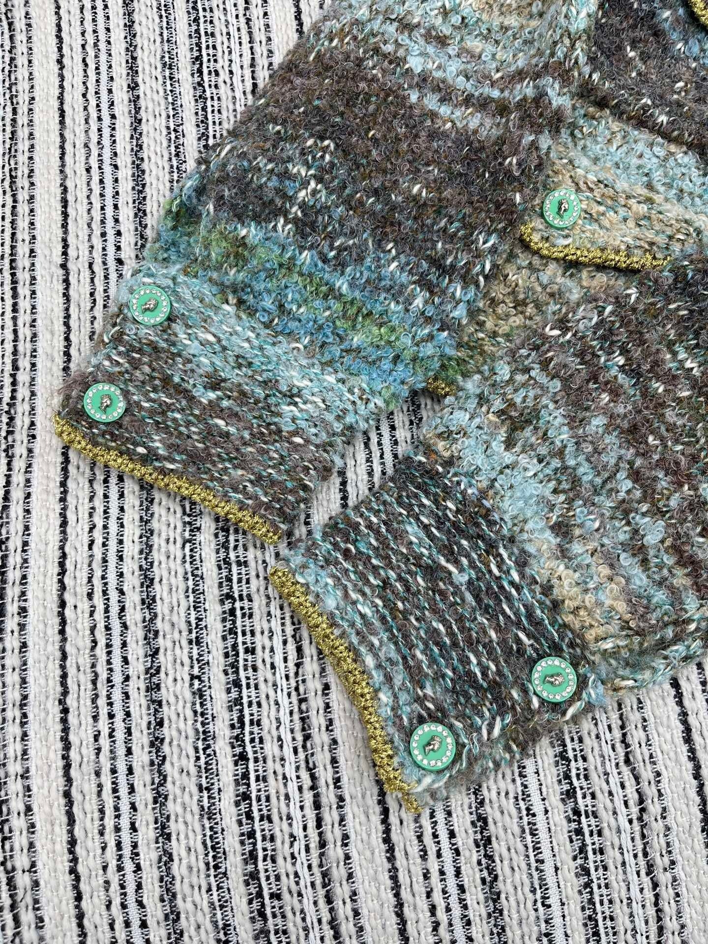 Cardigan court en maille bouclée multicolore (verts, bleus, beige), col chemise, patte de boutonnage et 4 poches à rabat. Boutons contrastants.