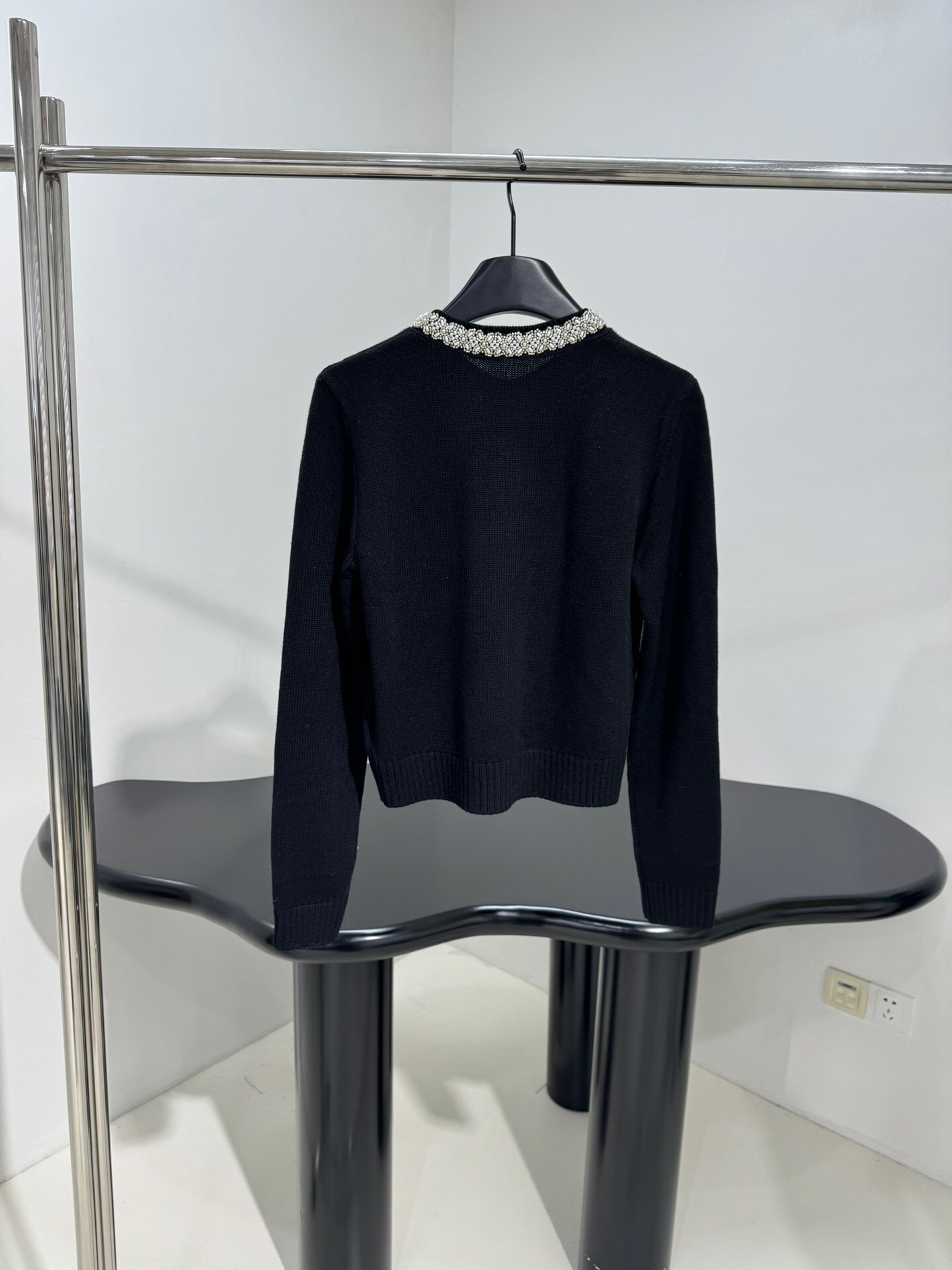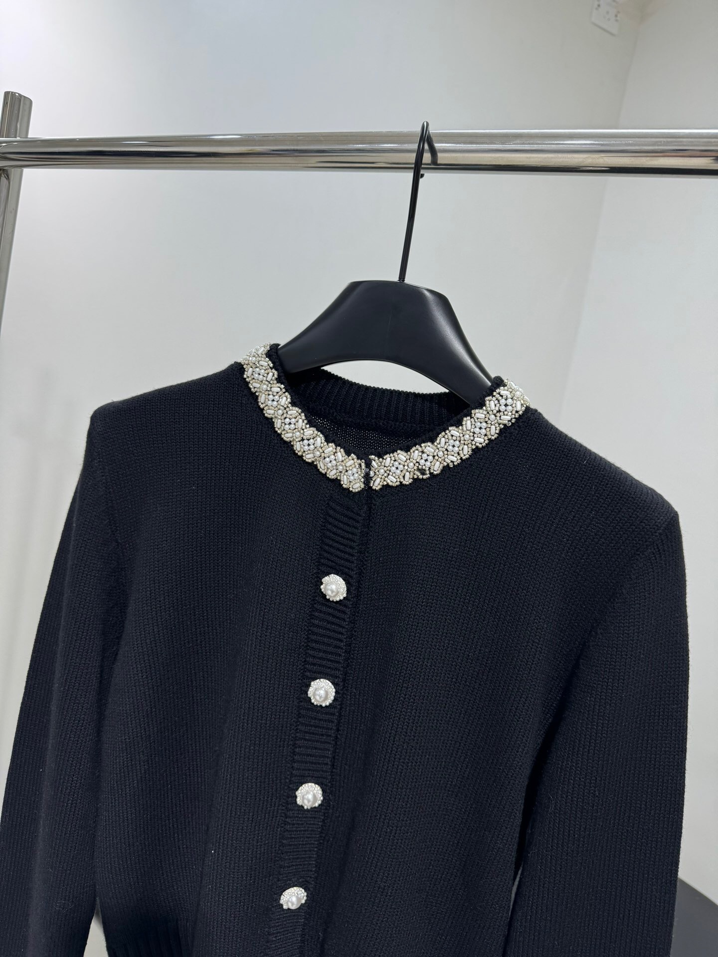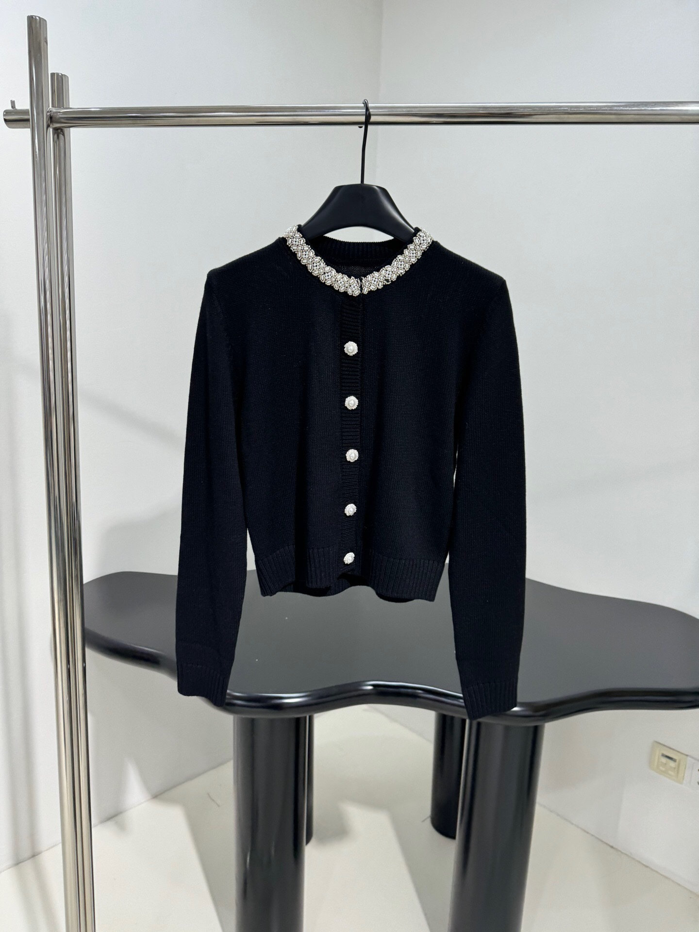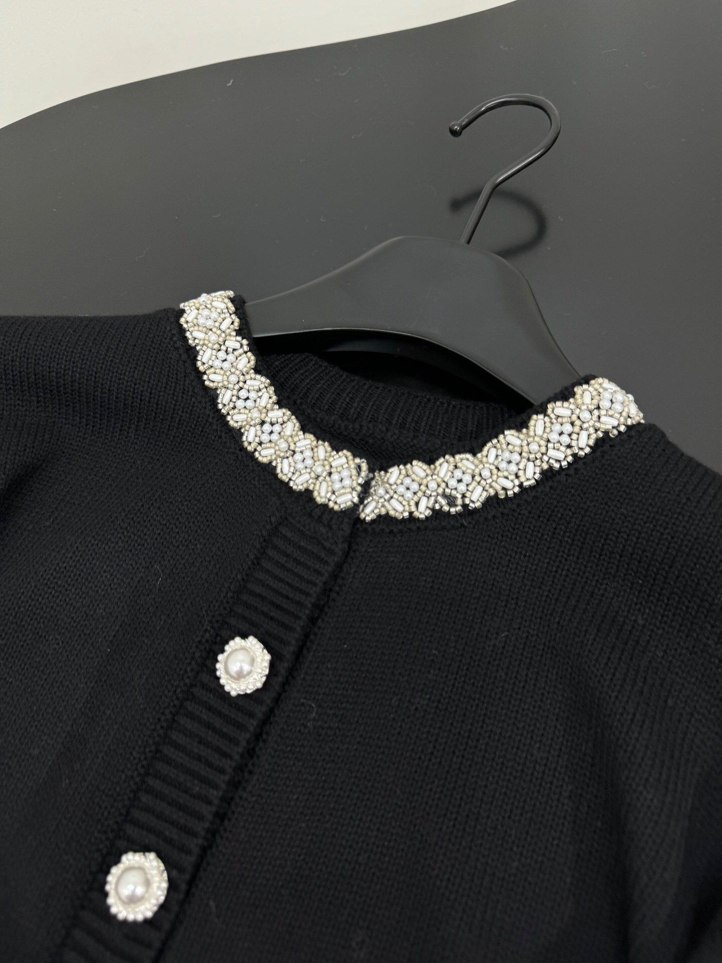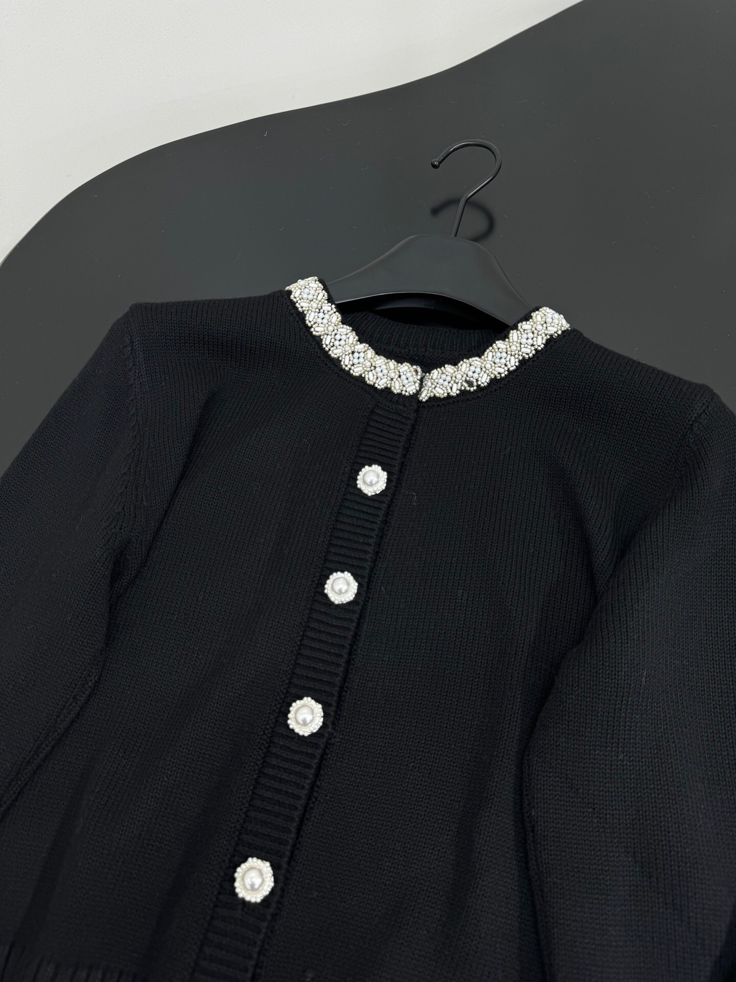 Classique mais audacieux, ce cardigan noir est un incontournable de la garde-robe. Sa coupe ajustée est magnifiquement mise en valeur par des détails précieux, en faisant la pièce idéale pour passer du jour au soir avec style.