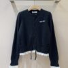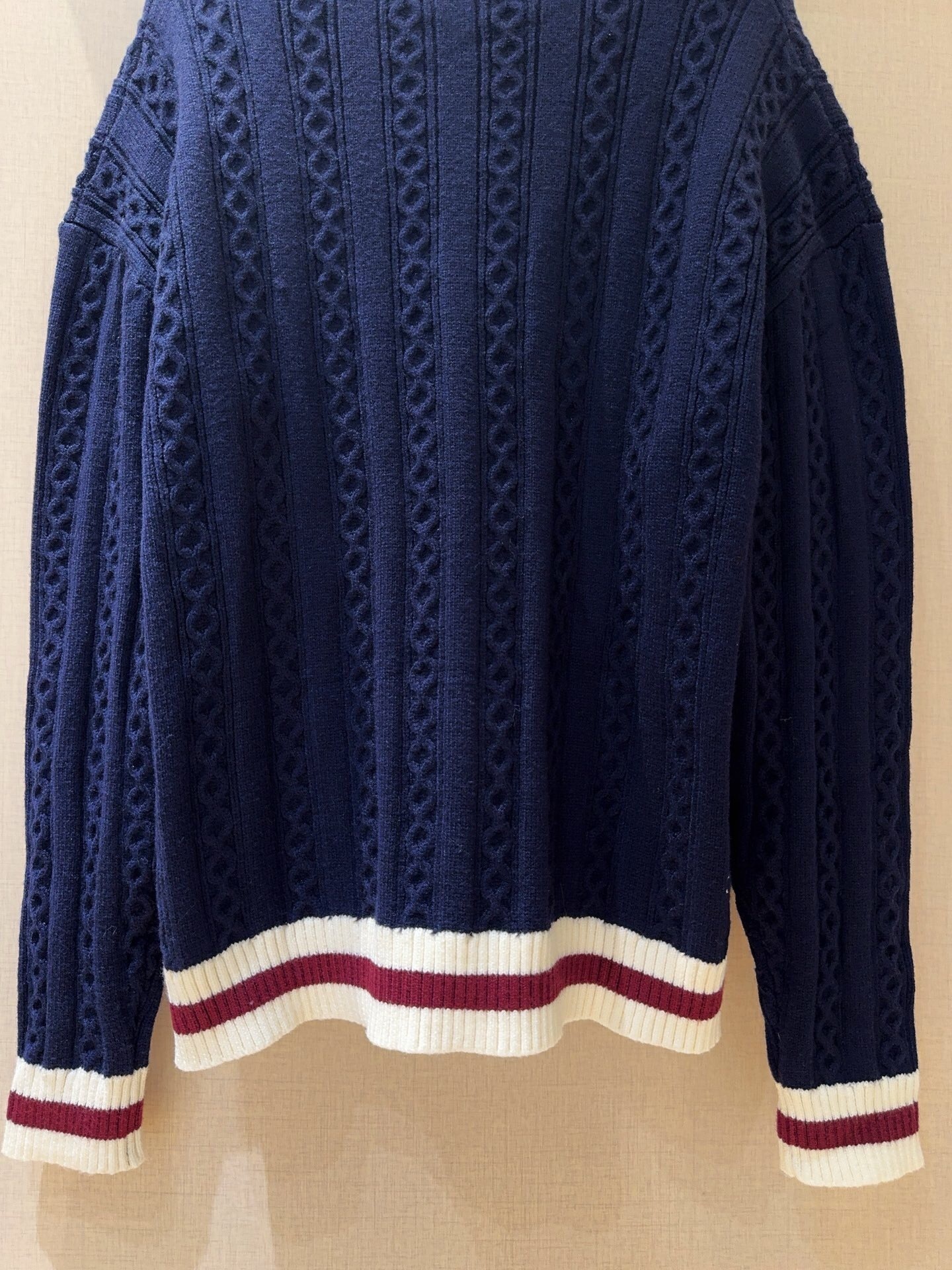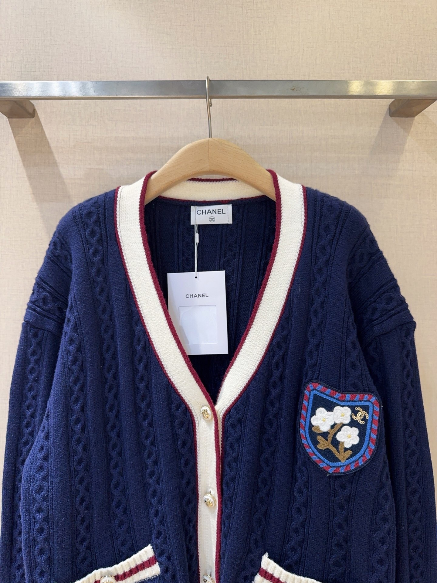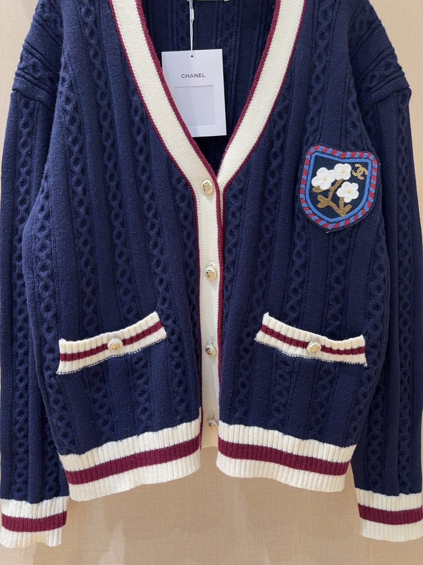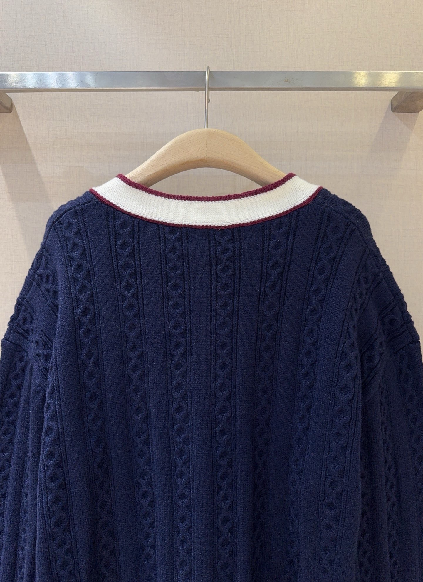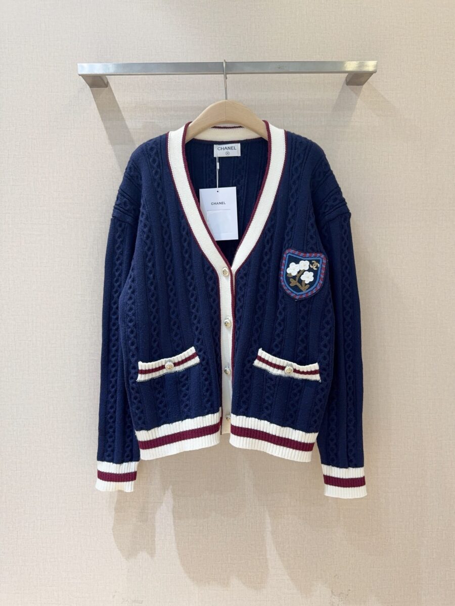 Un cardigan bleu marine d’inspiration « collège » avec une maille torsadée texturée. Ses bordures contrastées et son écusson brodé lui donnent un look preppy et distinctif.