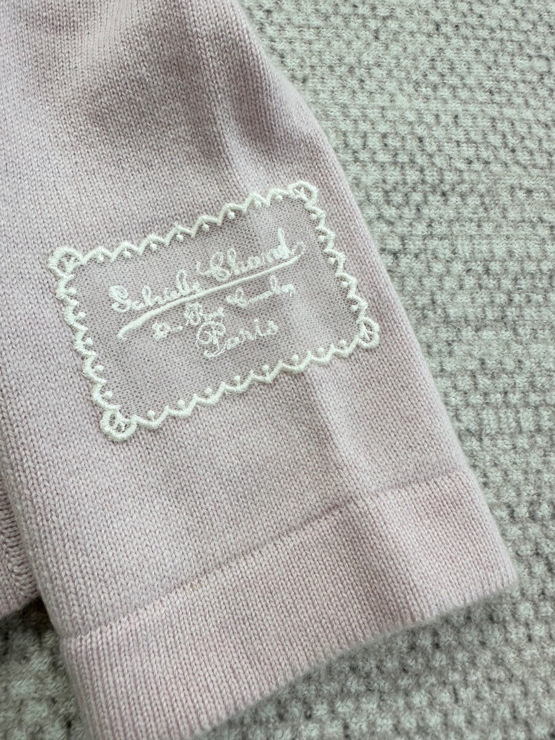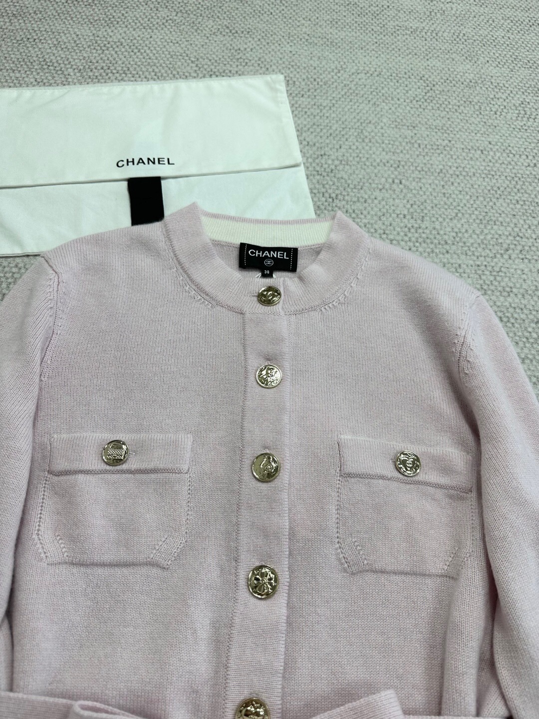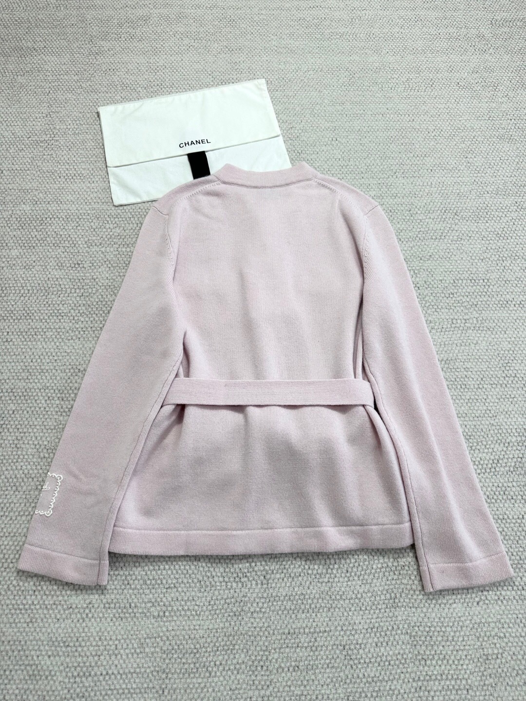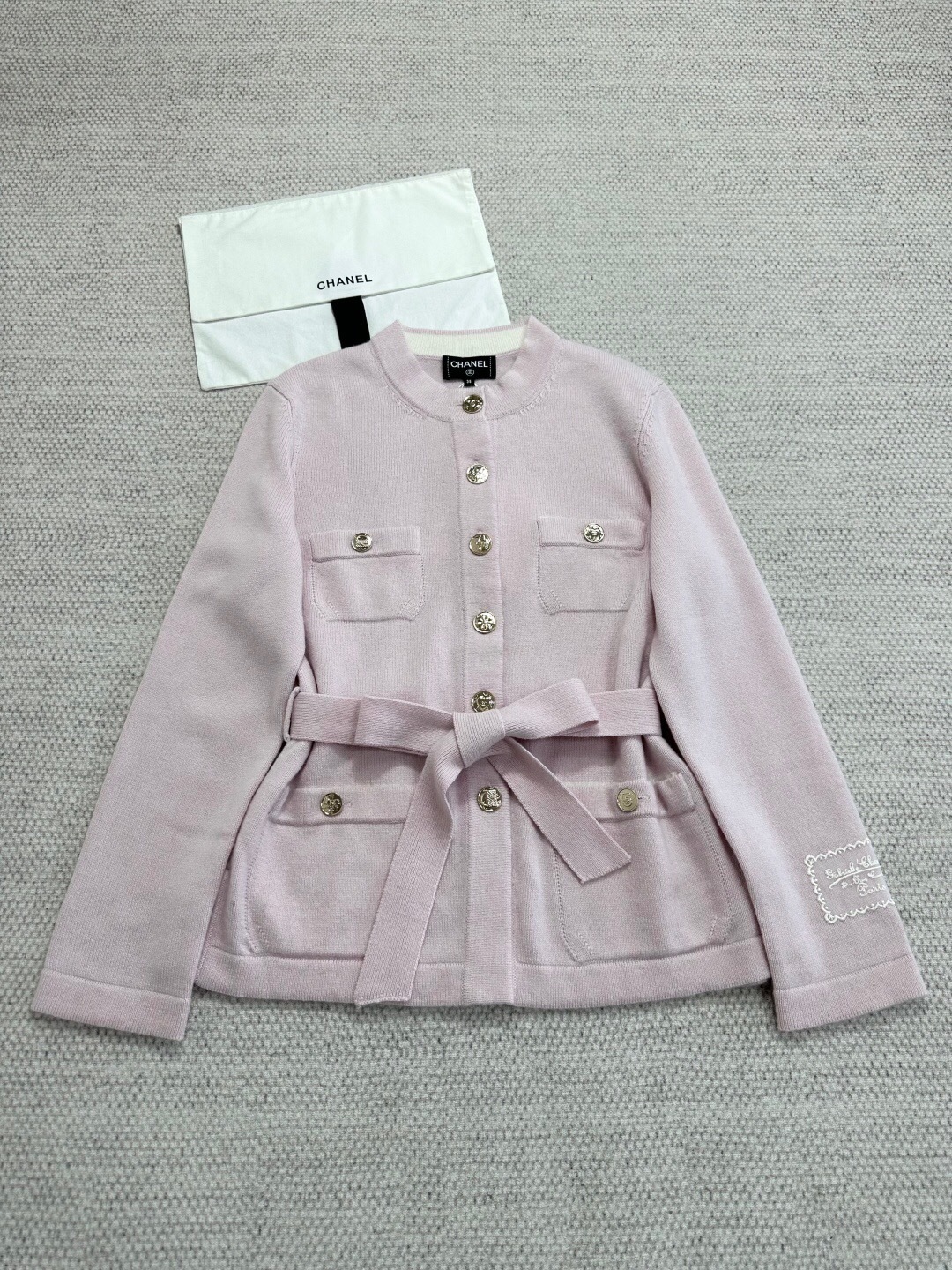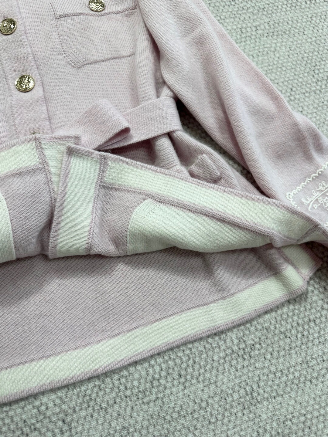 Un cardigan rose pâle structuré, style veste. Doté de quatre poches, de boutons dorés et d’une ceinture à nouer à la taille pour une silhouette définie.