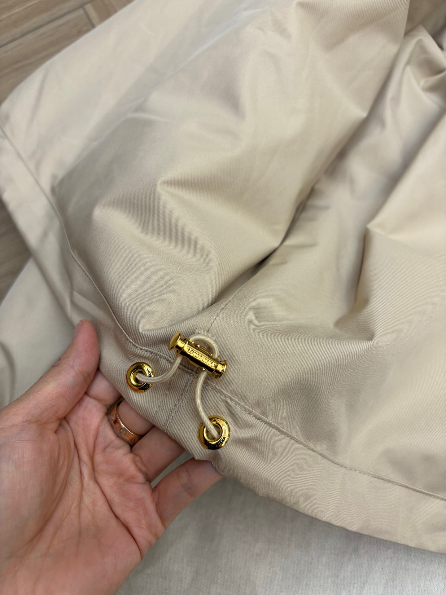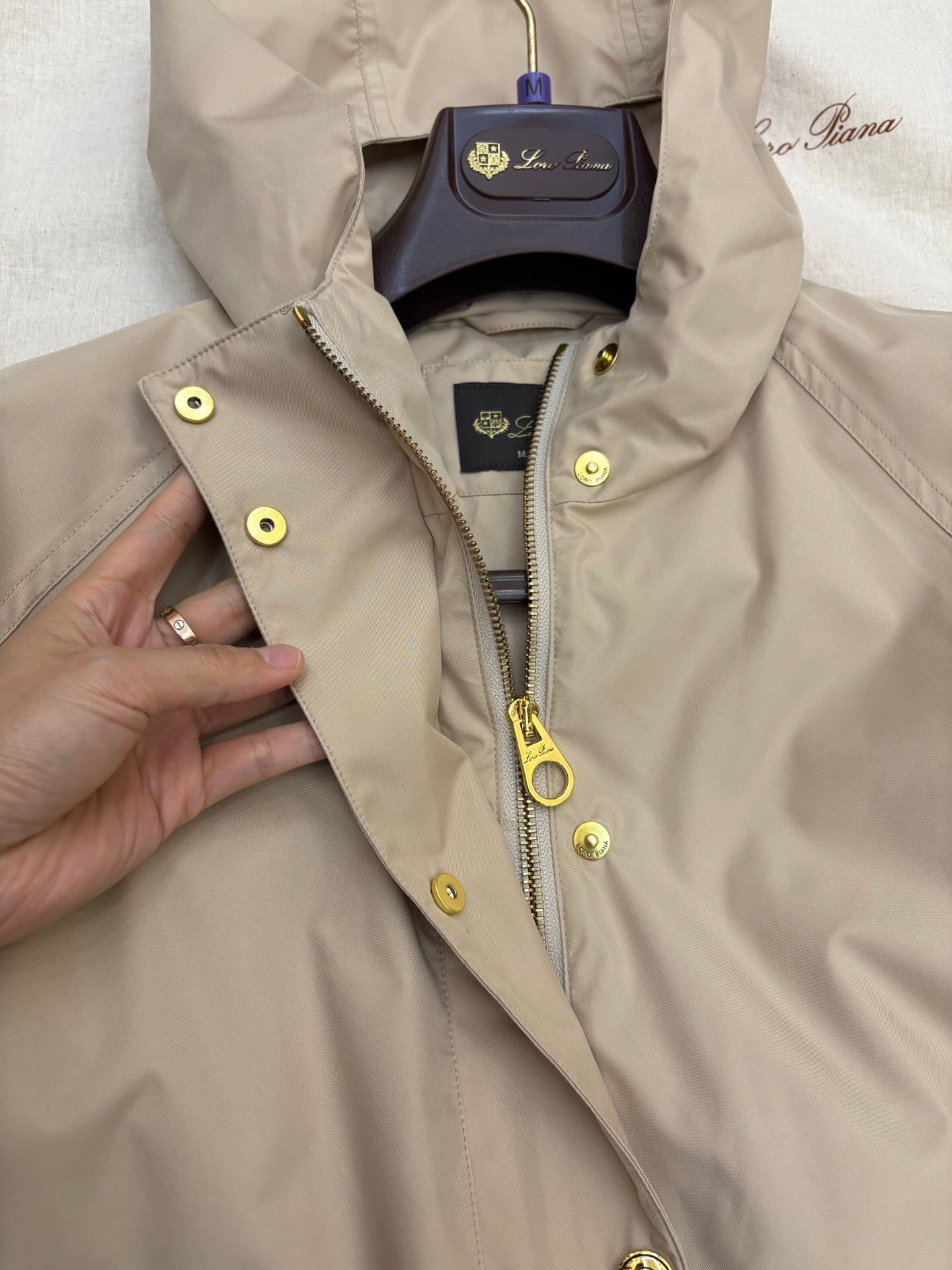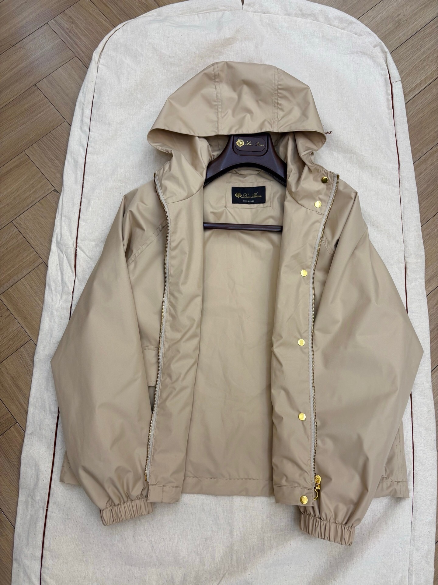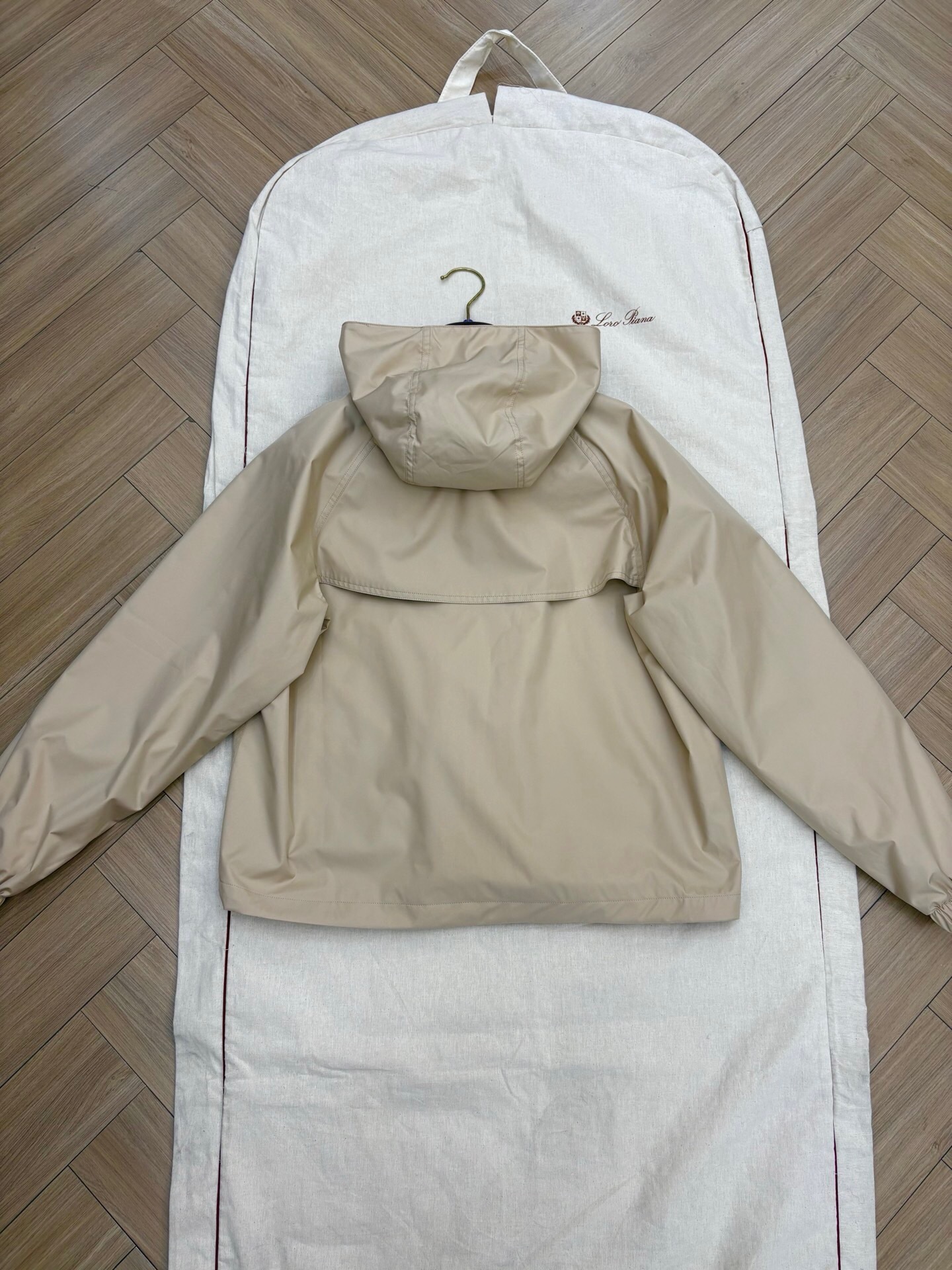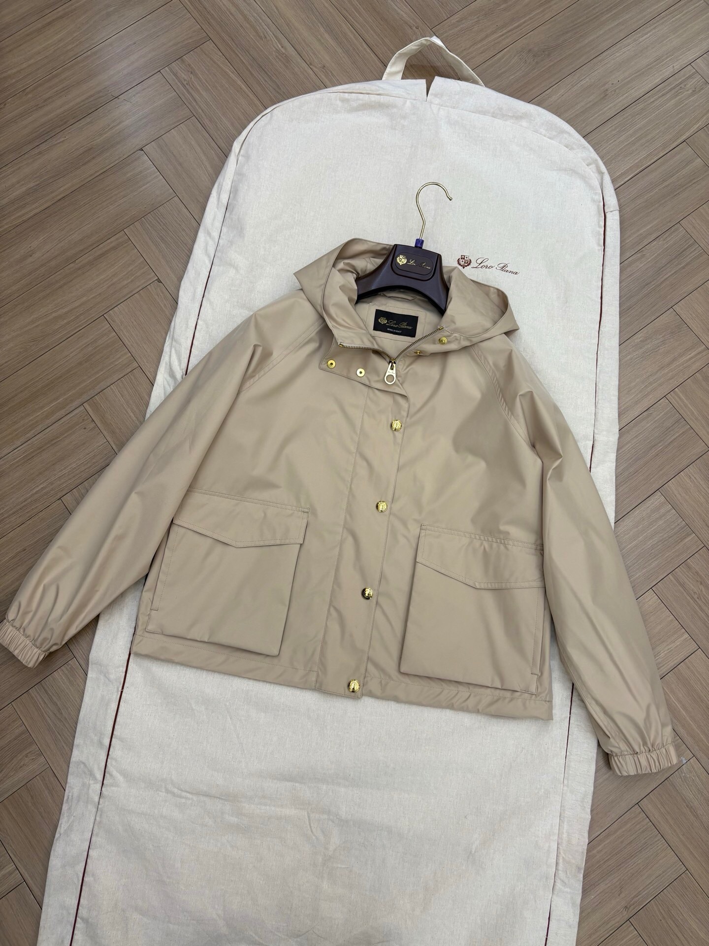 Un coupe-vent beige léger et fonctionnel. Doté d’une capuche, d’une fermeture éclair et de boutons-pression dorés, et de deux grandes poches à rabat. Idéal pour la mi-saison.