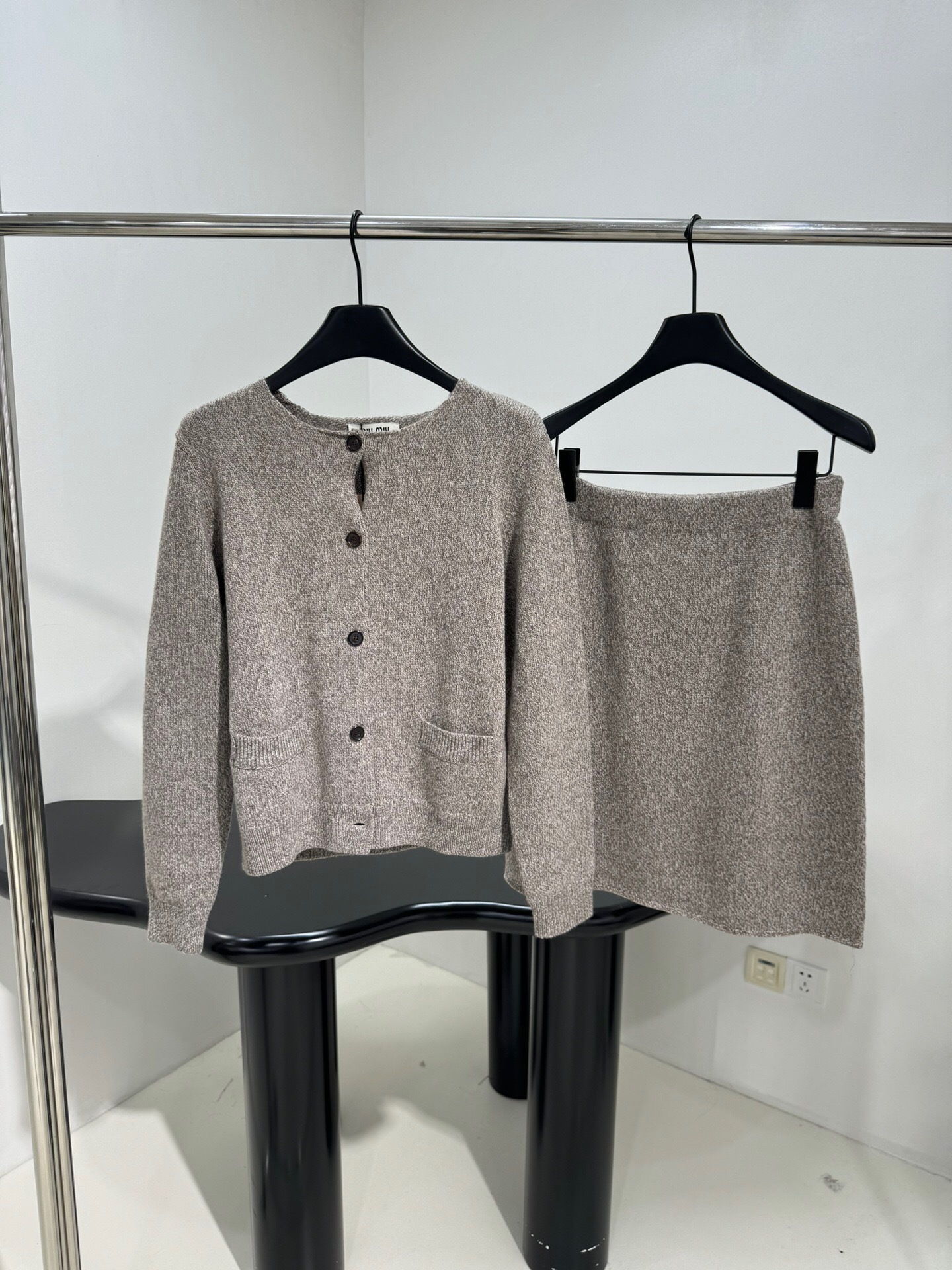 Cet ensemble deux pièces est la définition même du confort raffiné. Fabriqué dans une maille douce et texturée, il se compose d’un cardigan classique et d’une jupe assortie pour un style coordonné sans effort.