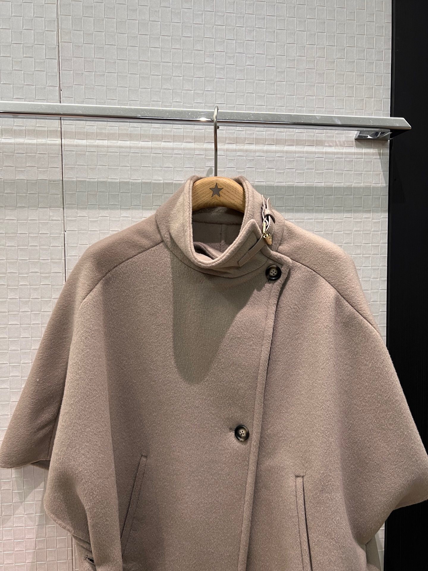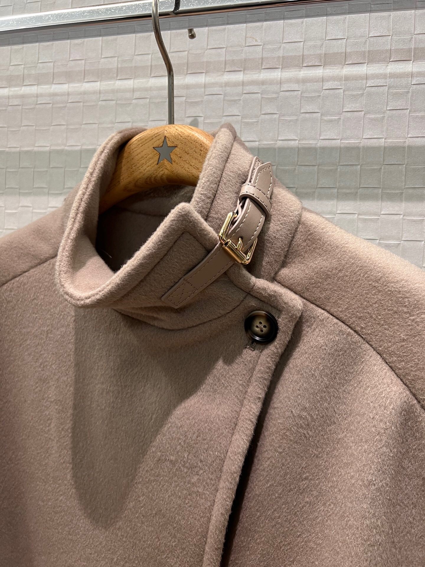 Épure graphique et confort enveloppant : cette cape courte beige sable mêle lignes minimalistes et détails couture. Taillée dans un drap de laine premium au tombé net, elle se distingue par son col officier fermé d’une bride en cuir à boucle métallisée. La coupe ample et fluide dessine une allure contemporaine, facile à superposer du matin au soir.