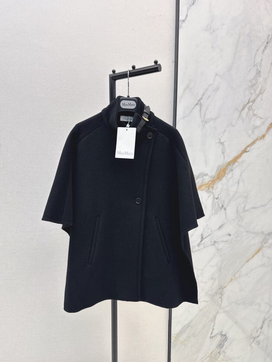 Cape courte en drap de laine premium, soulignée d’un col officier fermé par une bride en cuir. Noir profond, volume ample et poches passepoilées.