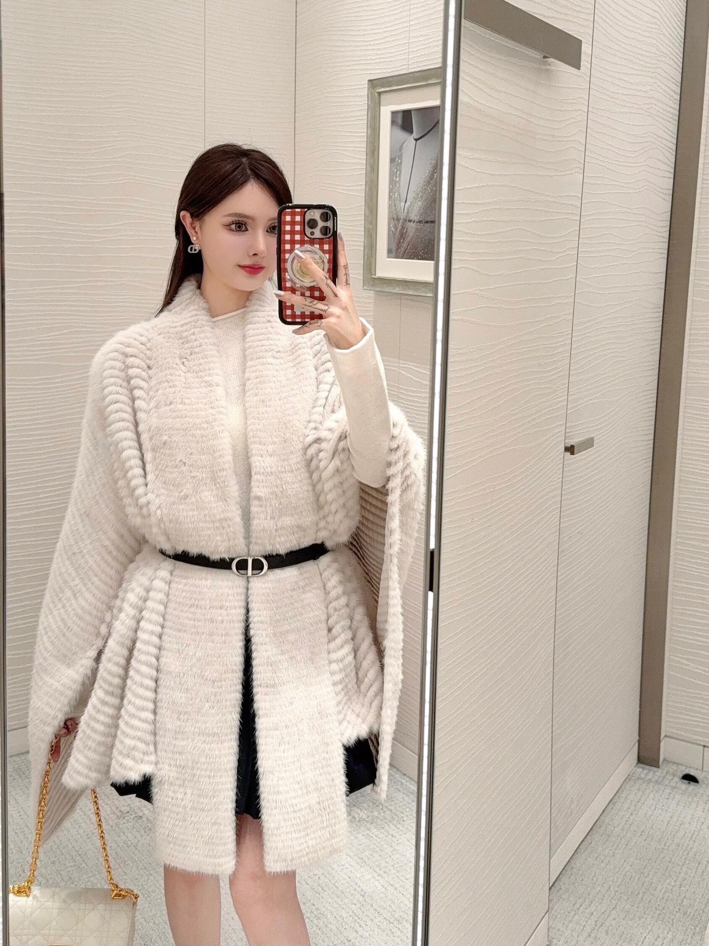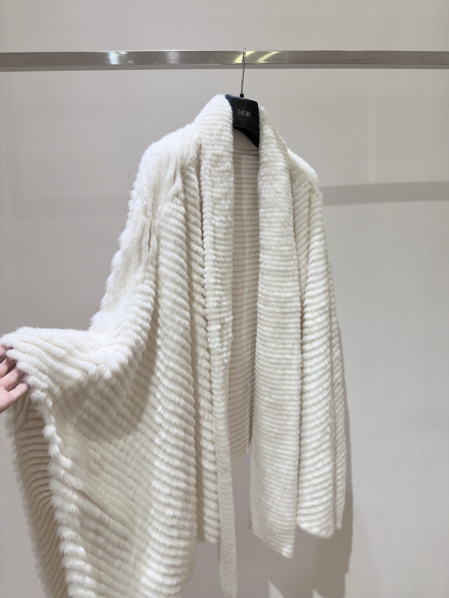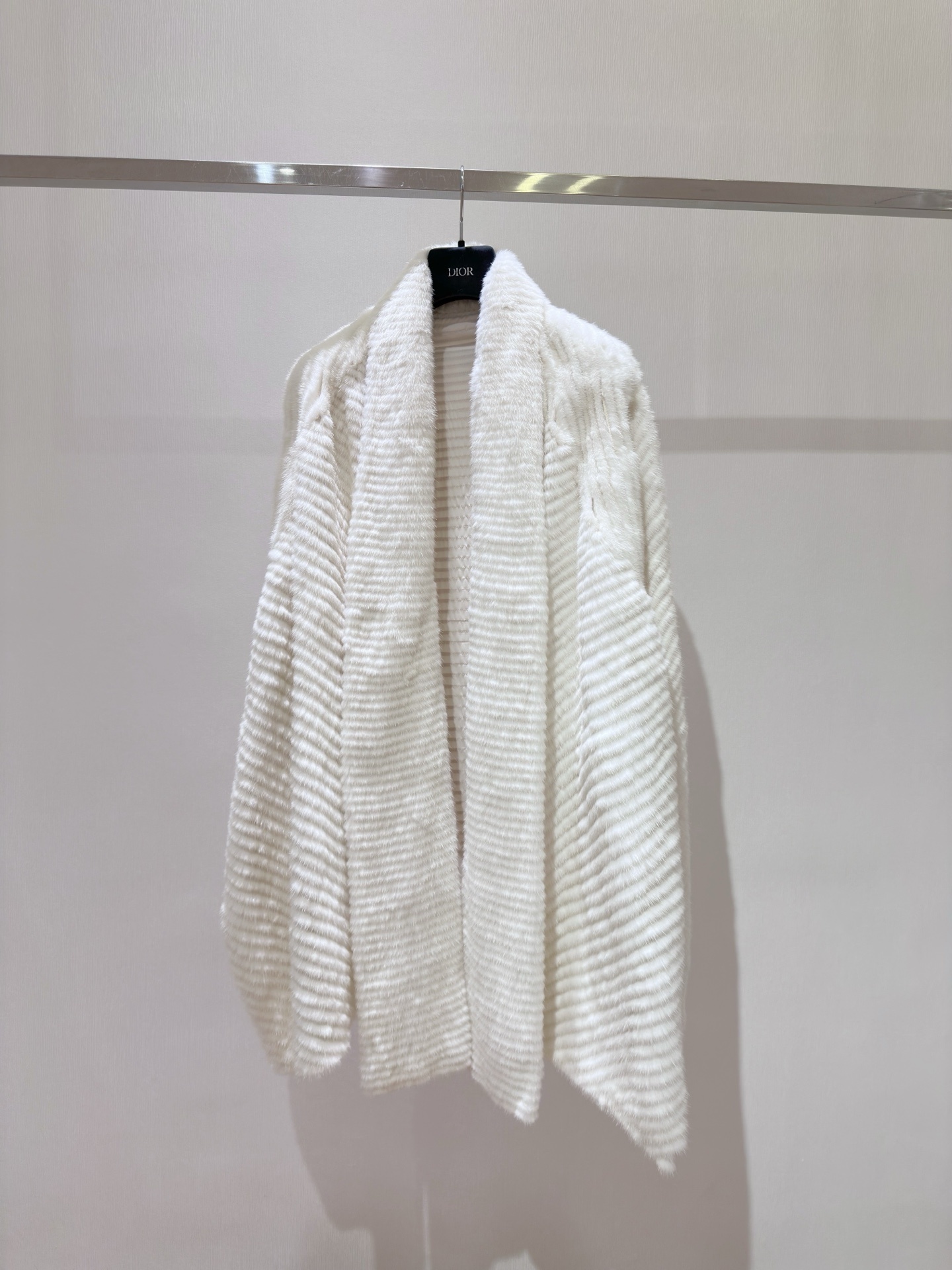 Poncho en fausse fourrure blanche, texture côtelée et col châle enveloppant. Coupe ample, tombé fluide, parfait pour superposer.