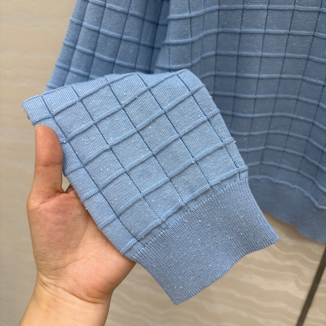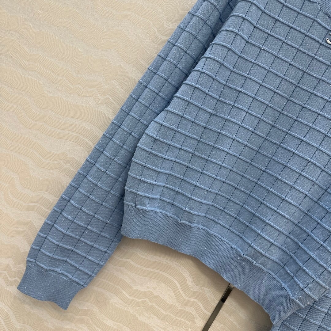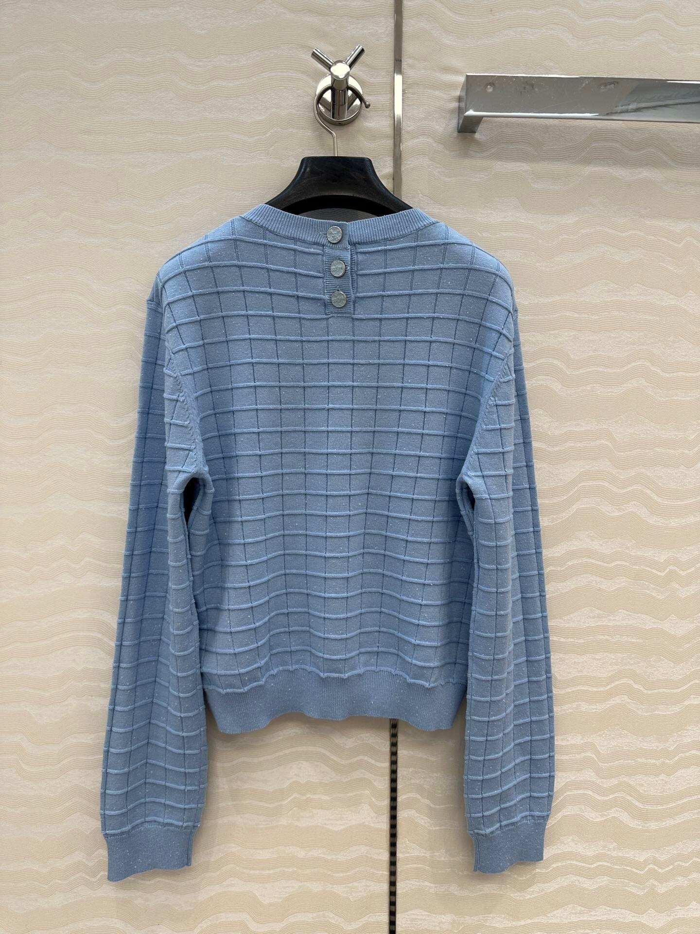 Un pull élégant en maille texturée bleu ciel. Il présente un motif quadrillé discret, un col rond avec un petit logo et une fermeture boutonnée au dos.