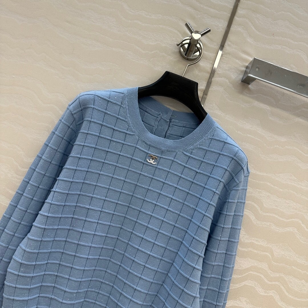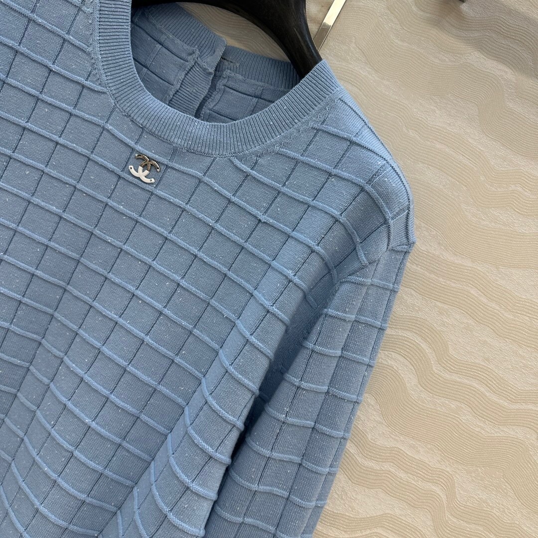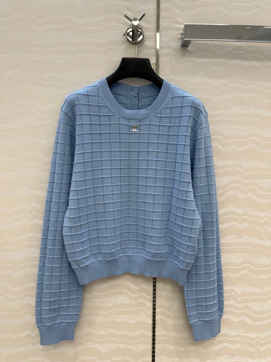 Un pull élégant en maille texturée bleu ciel. Il présente un motif quadrillé discret, un col rond avec un petit logo et une fermeture boutonnée au dos.