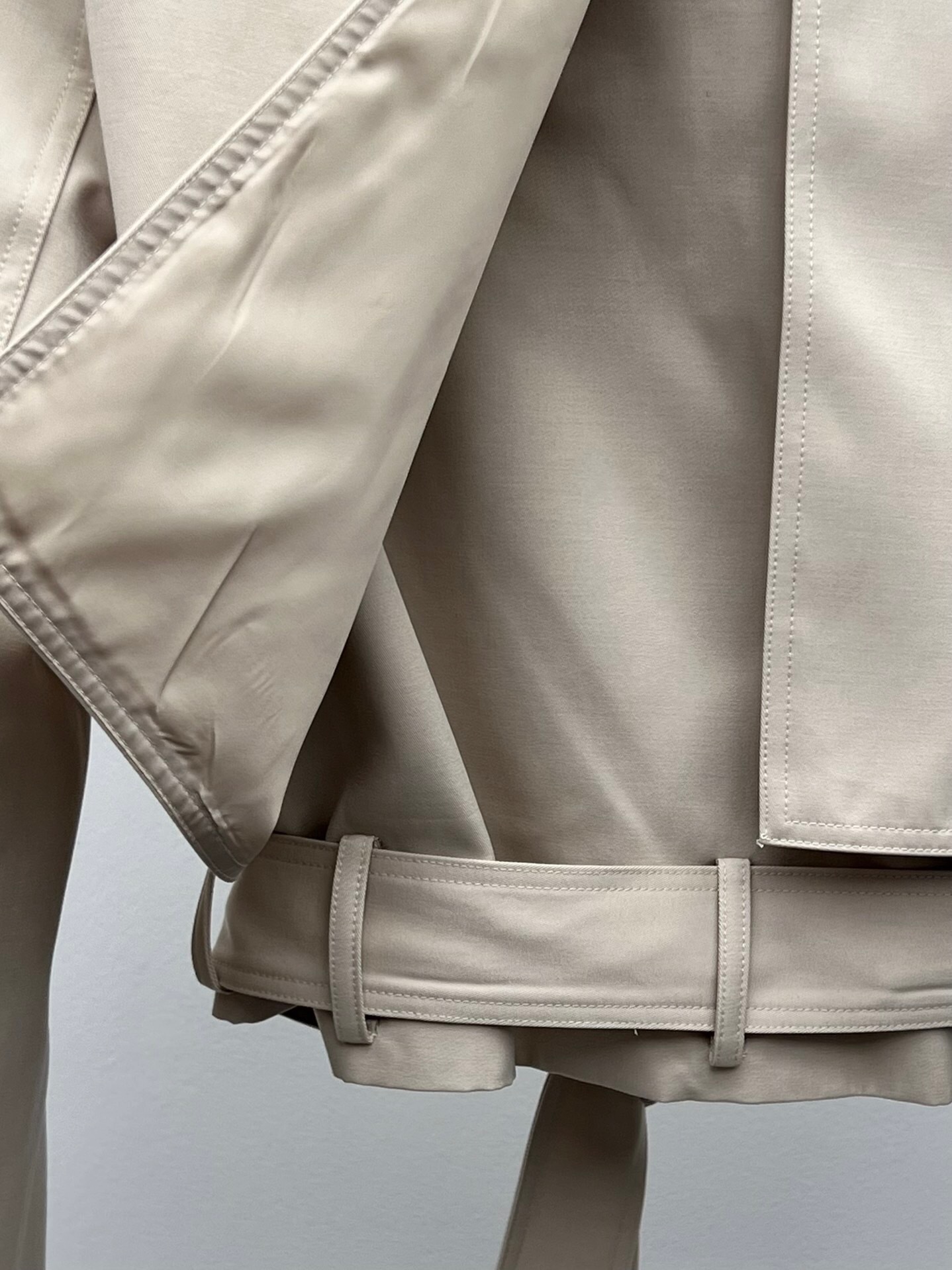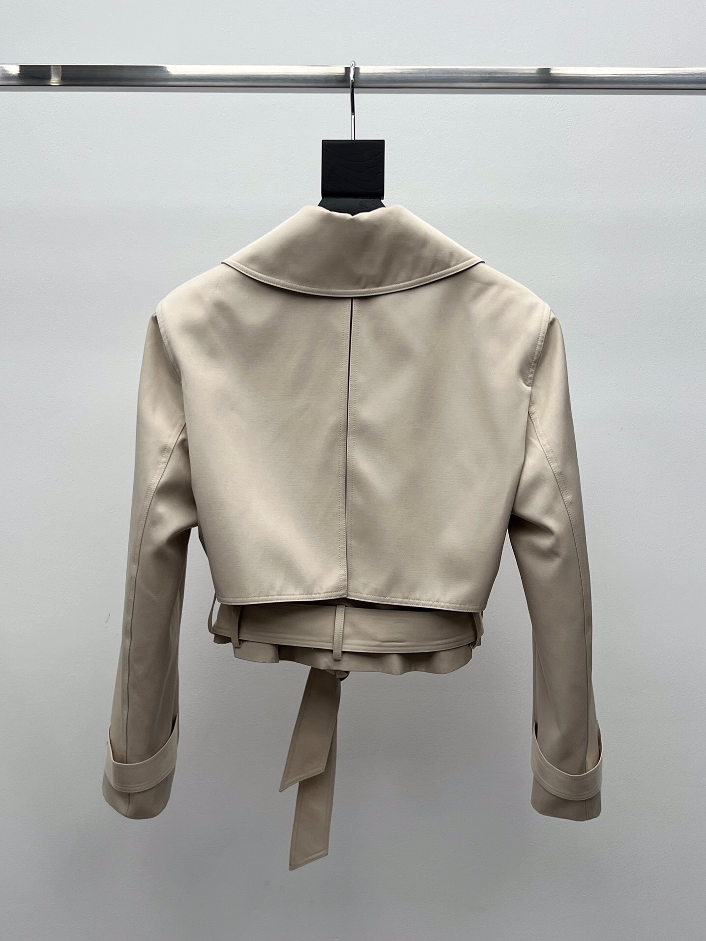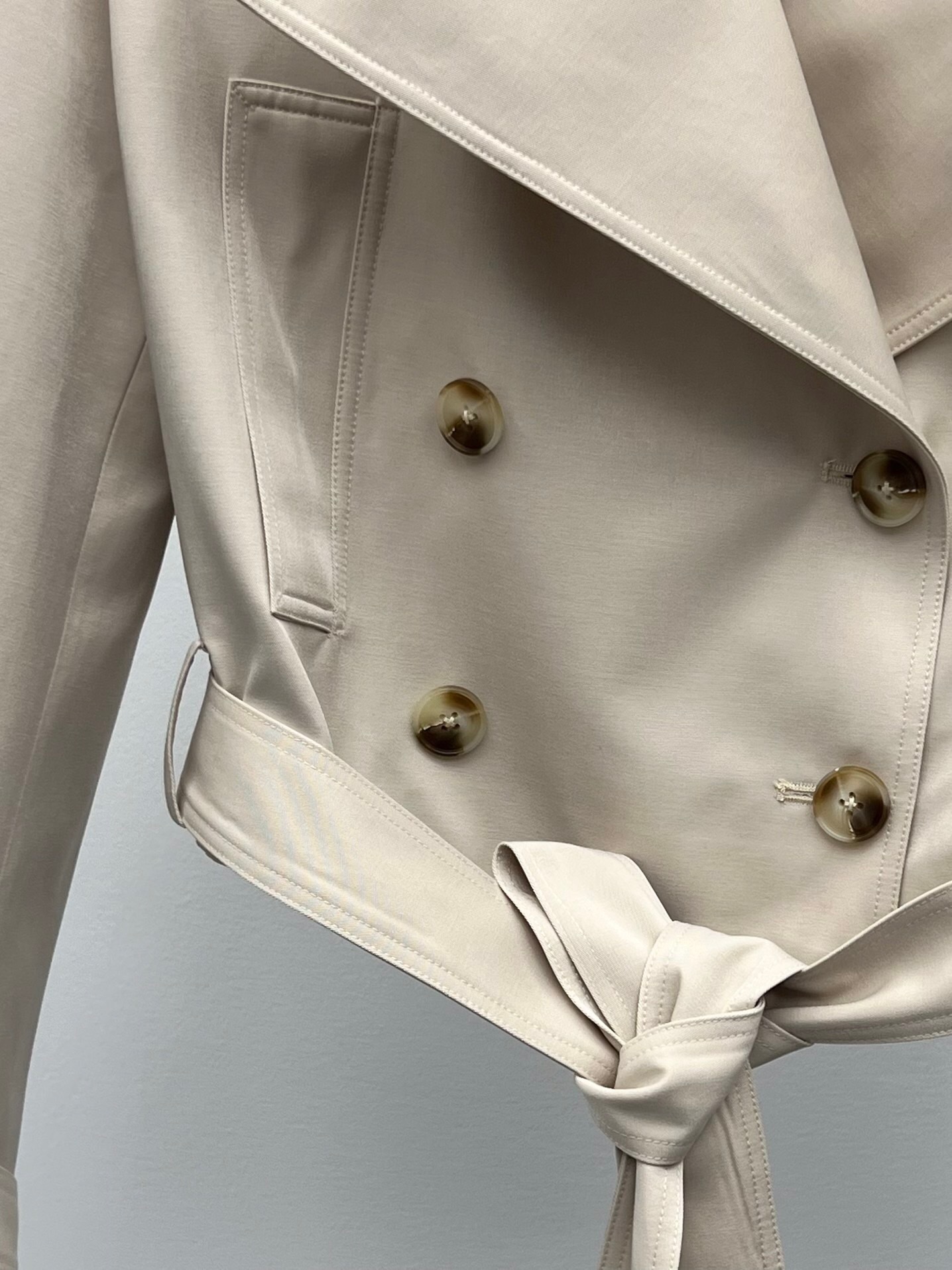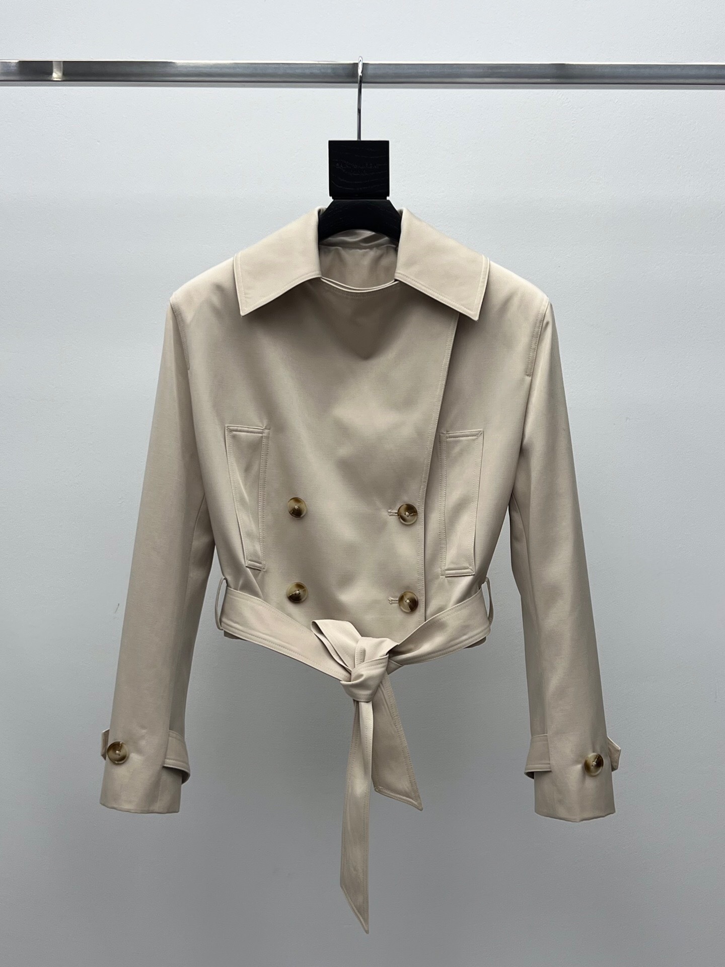 Une version moderne et courte du trench-coat classique. Cette veste beige est dotée d’une fermeture croisée et d’une ceinture assortie pour définir la silhouette avec élégance.