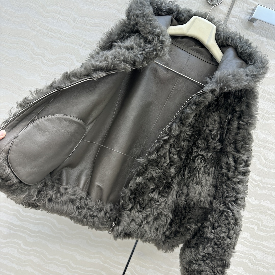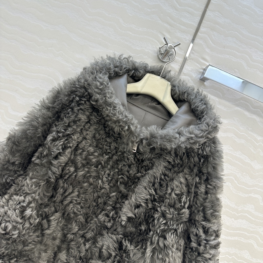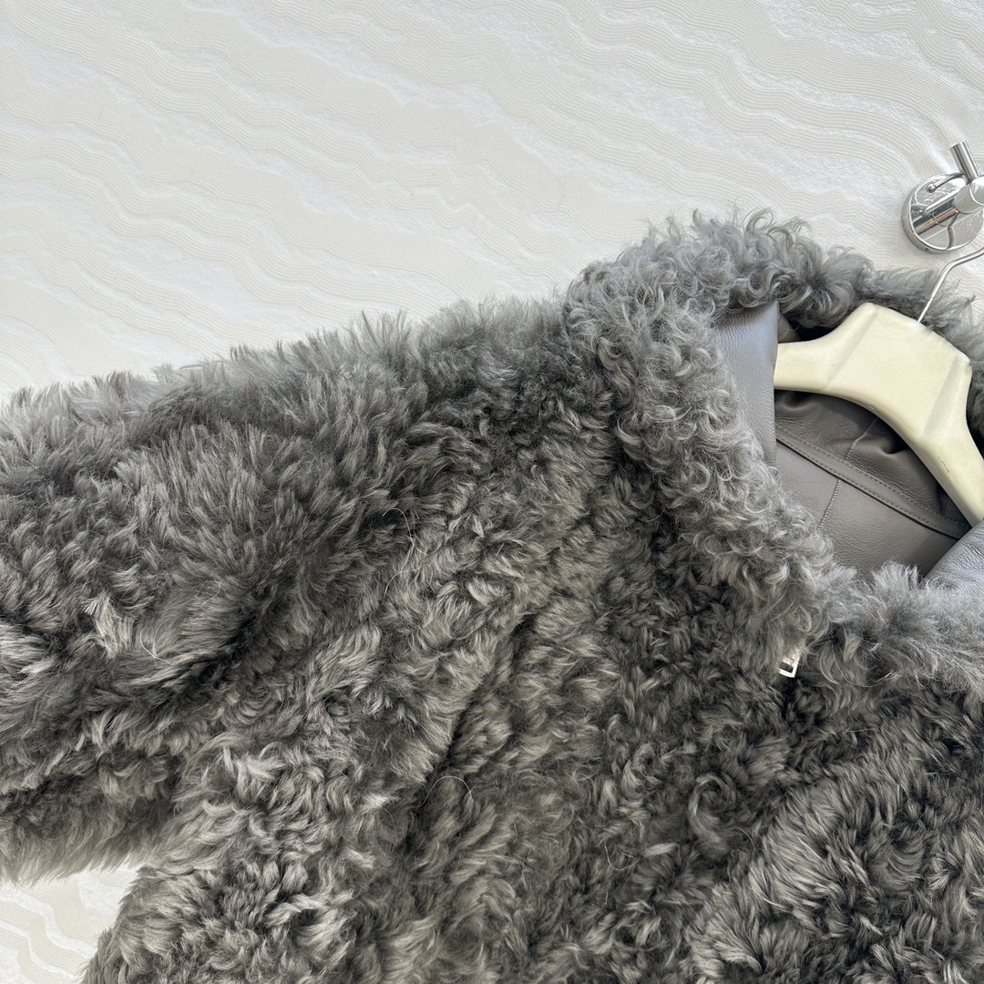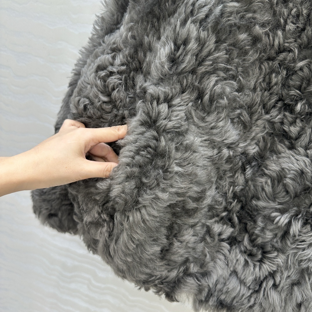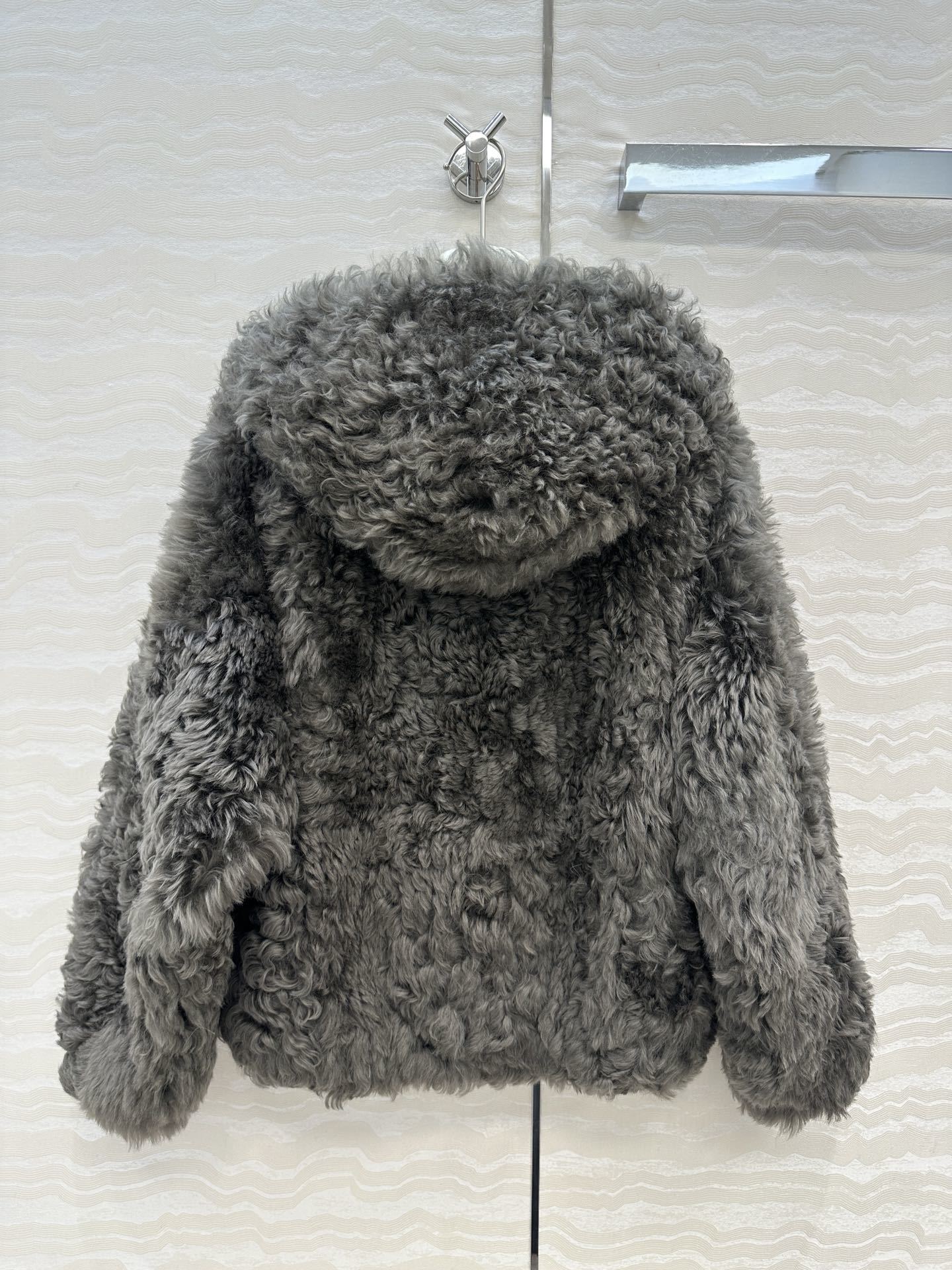 Veste à capuche en fausse fourrure bouclée anthracite, fermeture frontale discrète et poches côtés. Volume cocoon et chaleur douce.