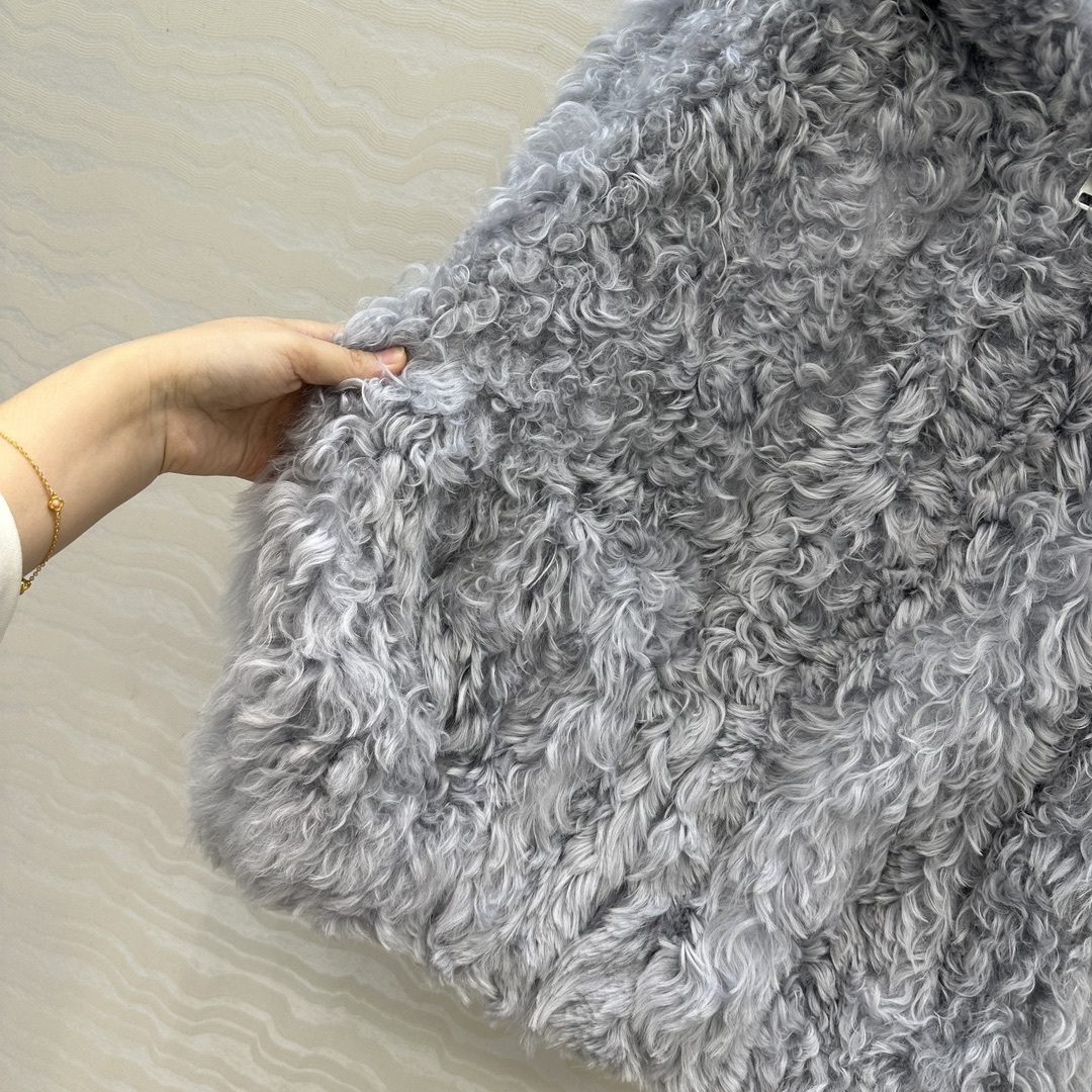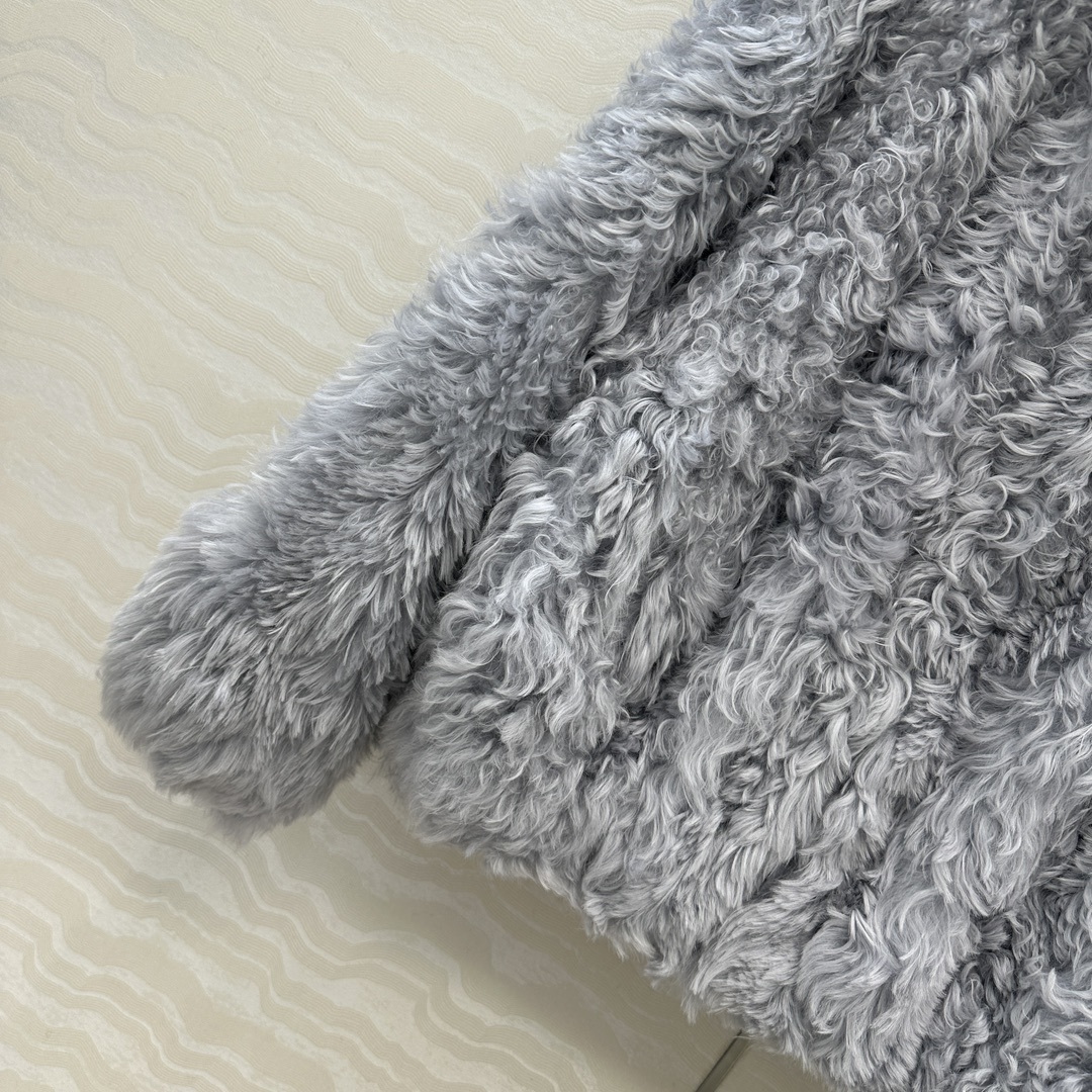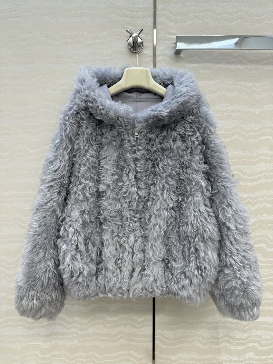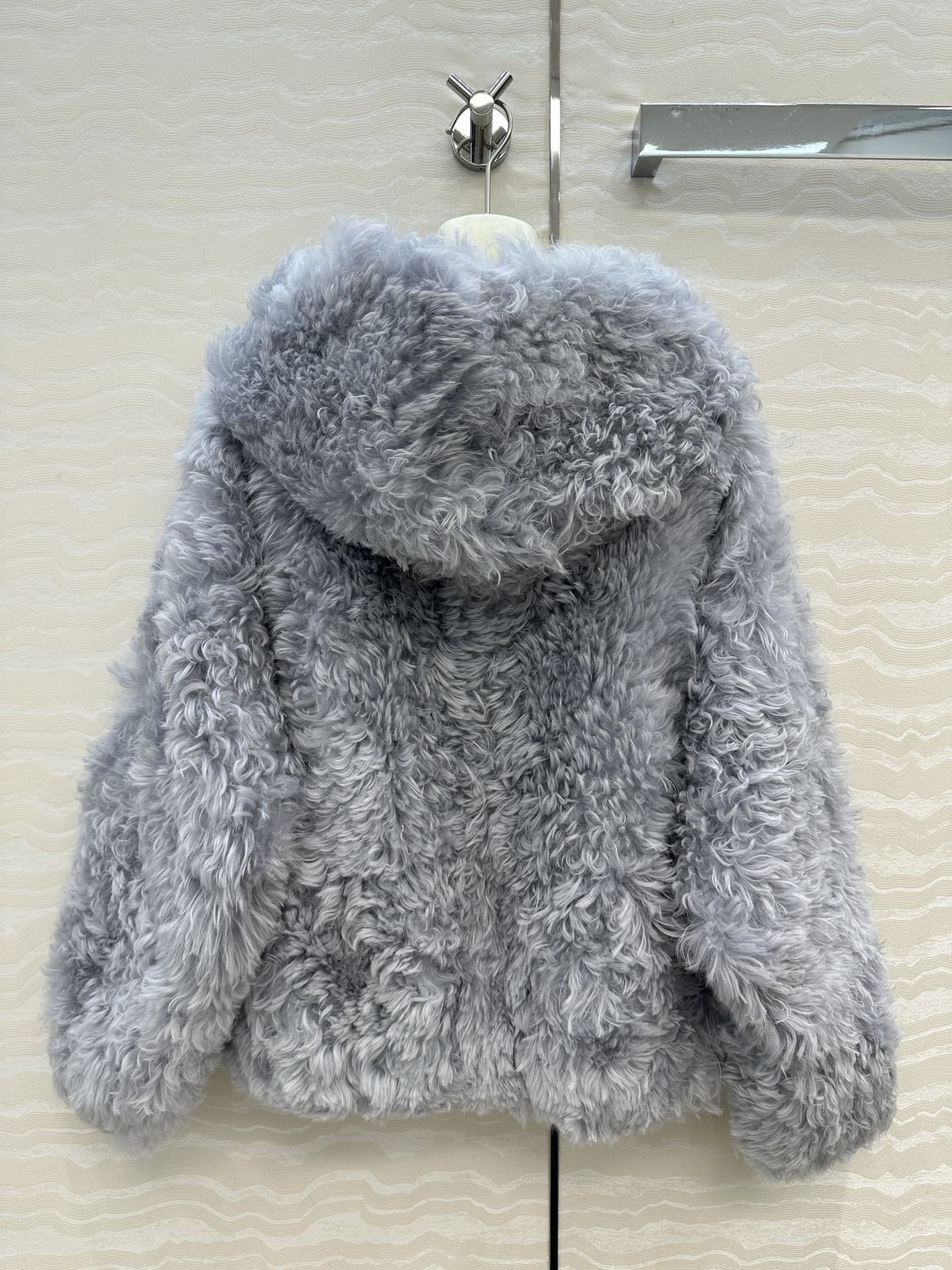 Veste à capuche en fausse fourrure bouclée grise, volume cocoon et fermeture frontale dissimulée. Doublure douce, manches longues.