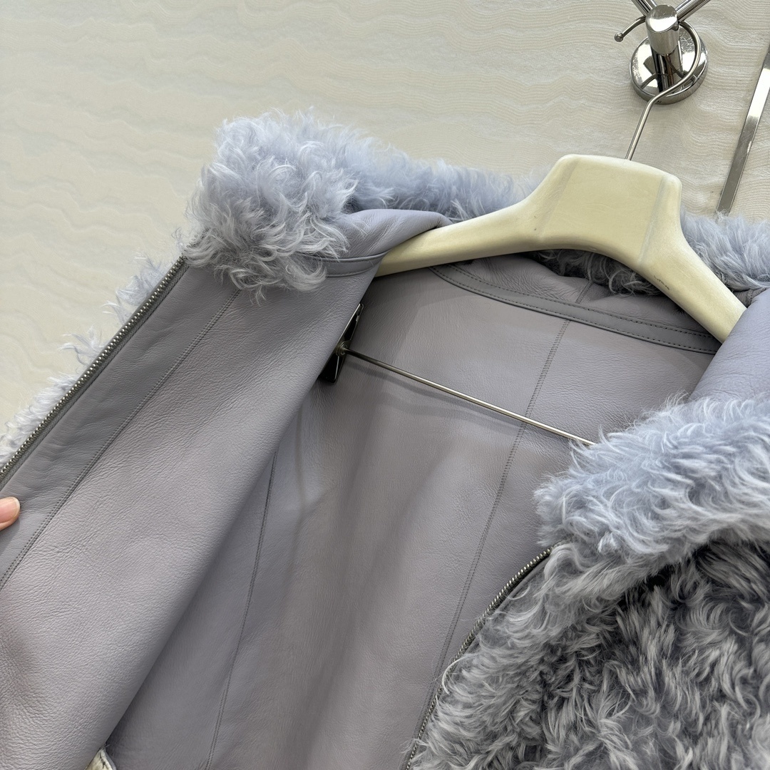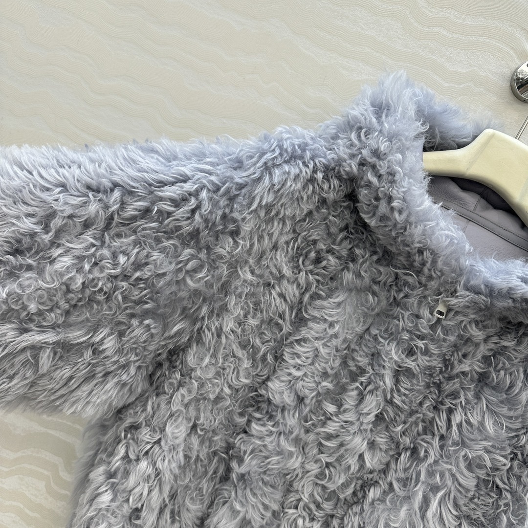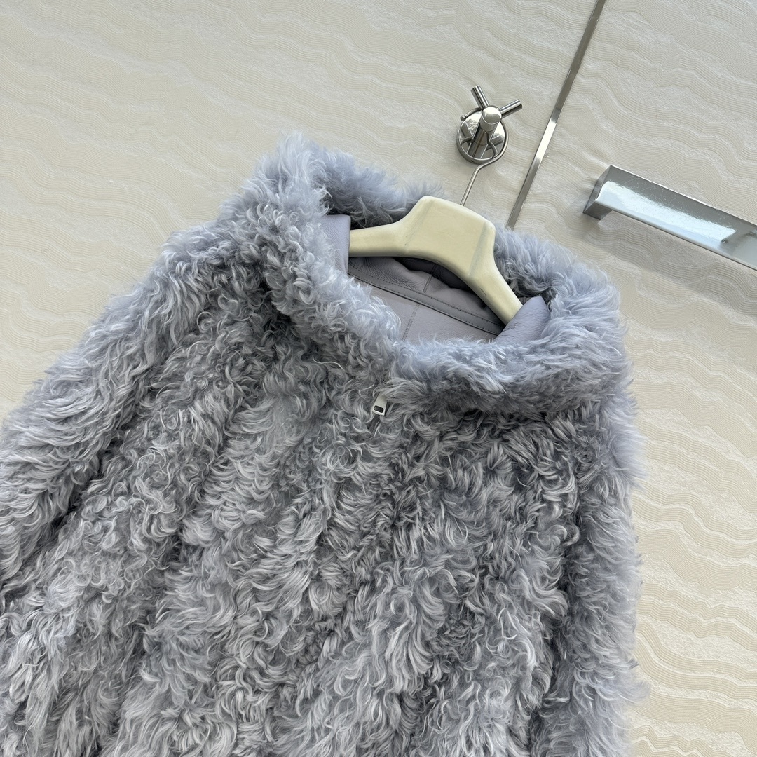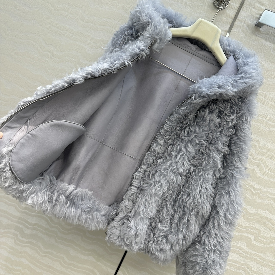 Veste à capuche en fausse fourrure bouclée grise, volume cocoon et fermeture frontale dissimulée. Doublure douce, manches longues.