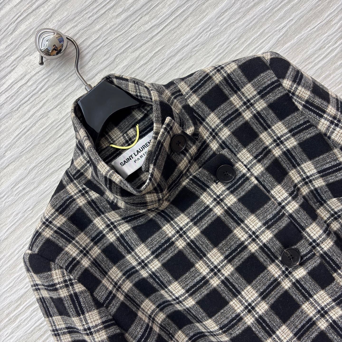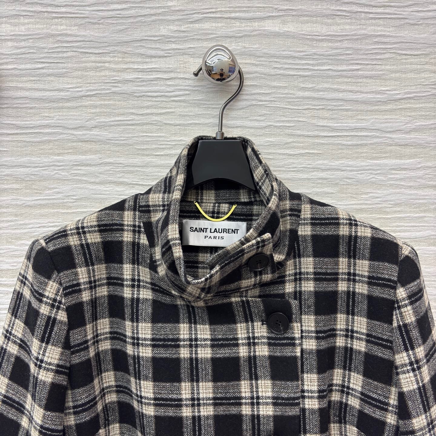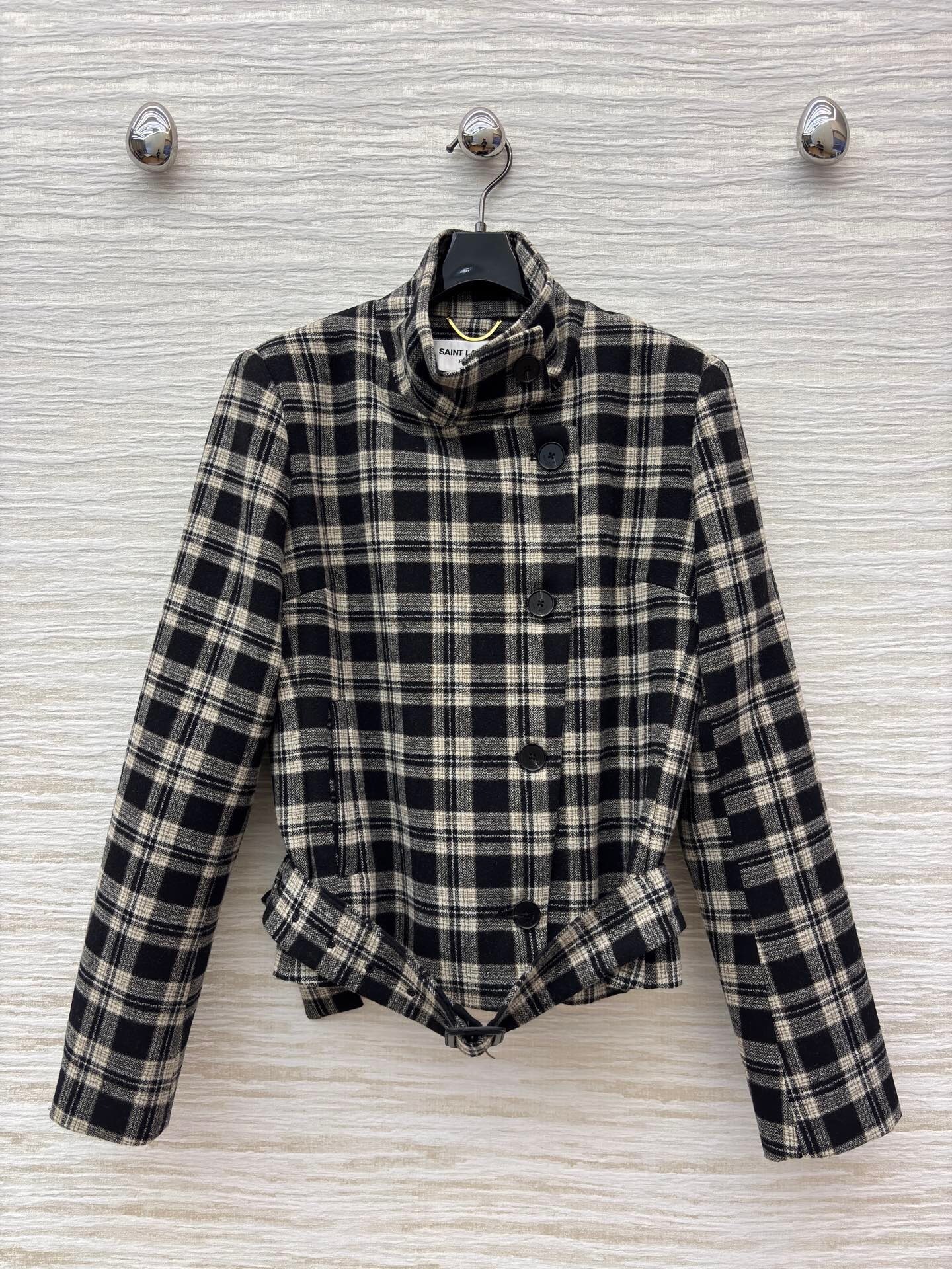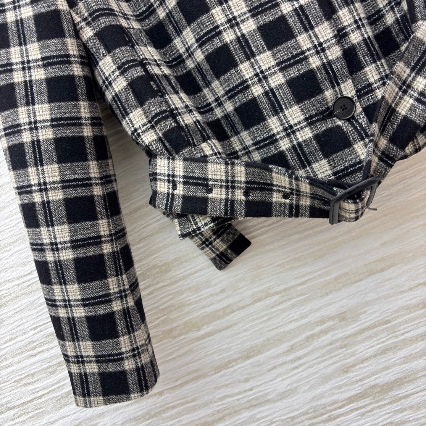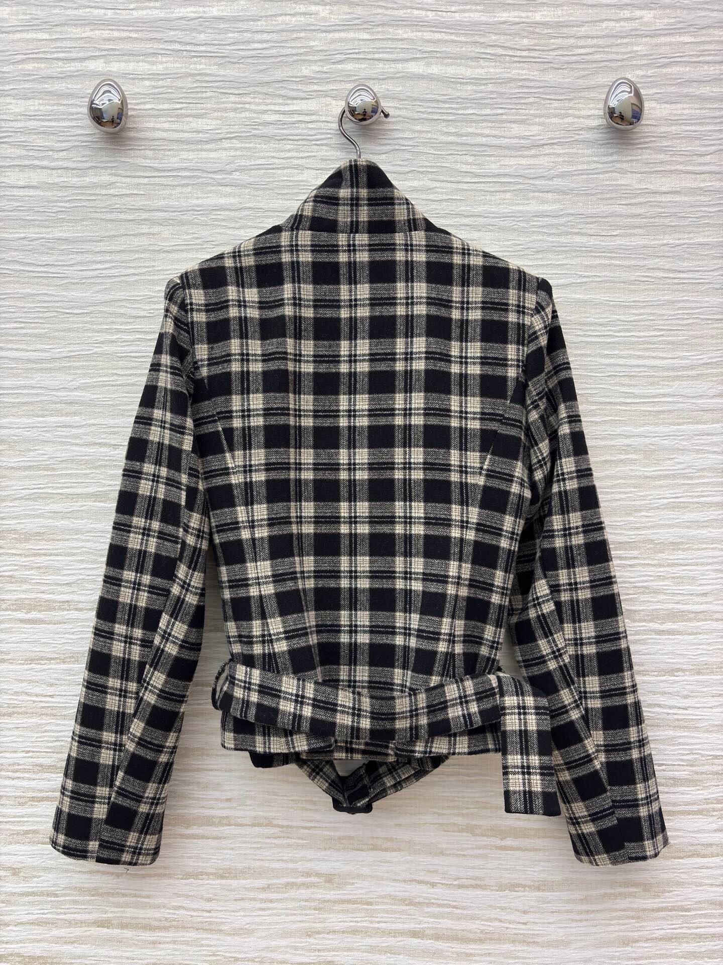 Une veste courte et structurée à motif carreaux (noir et beige). Dotée d’un col montant asymétrique et d’une ceinture assortie à la taille.