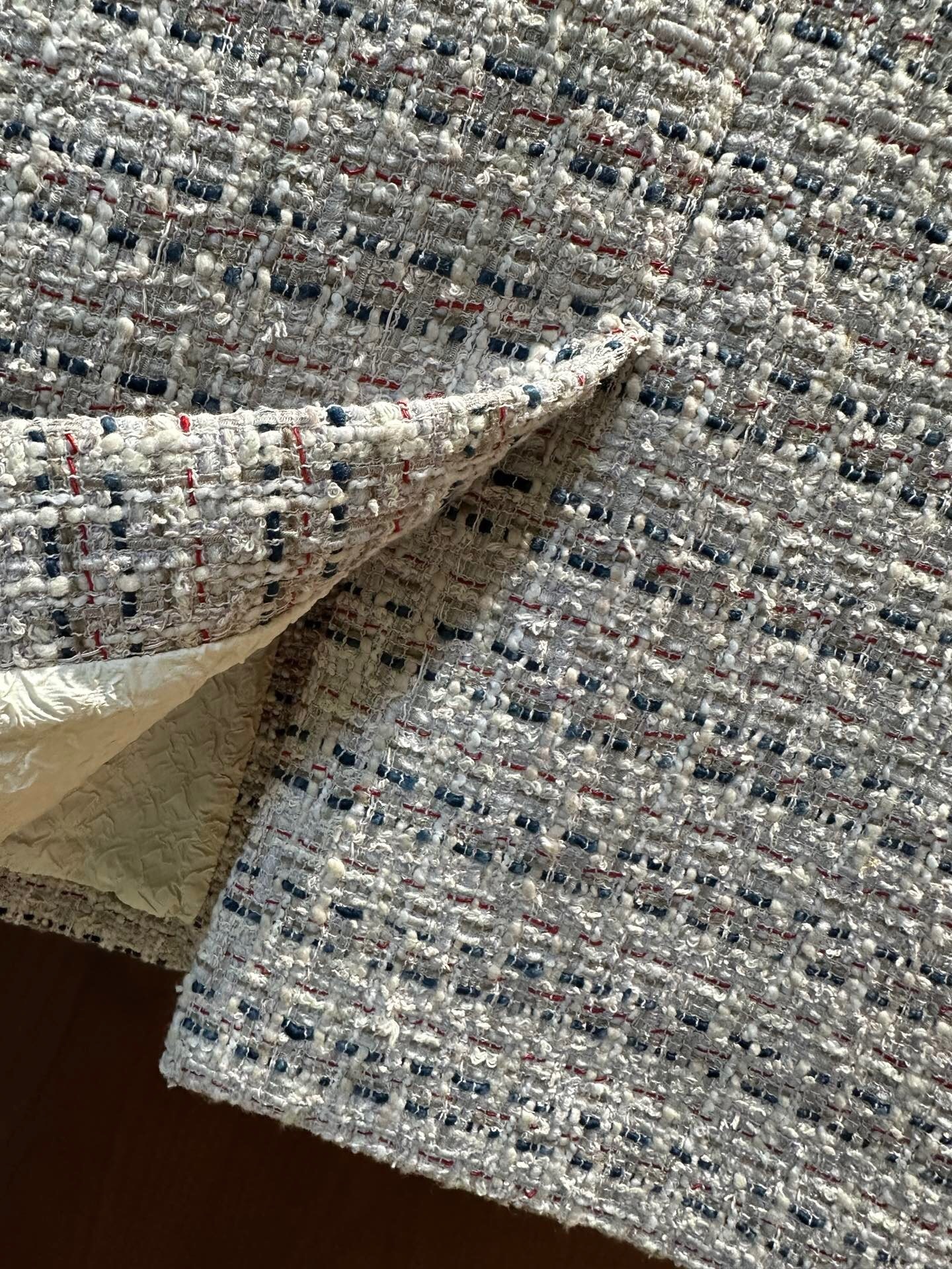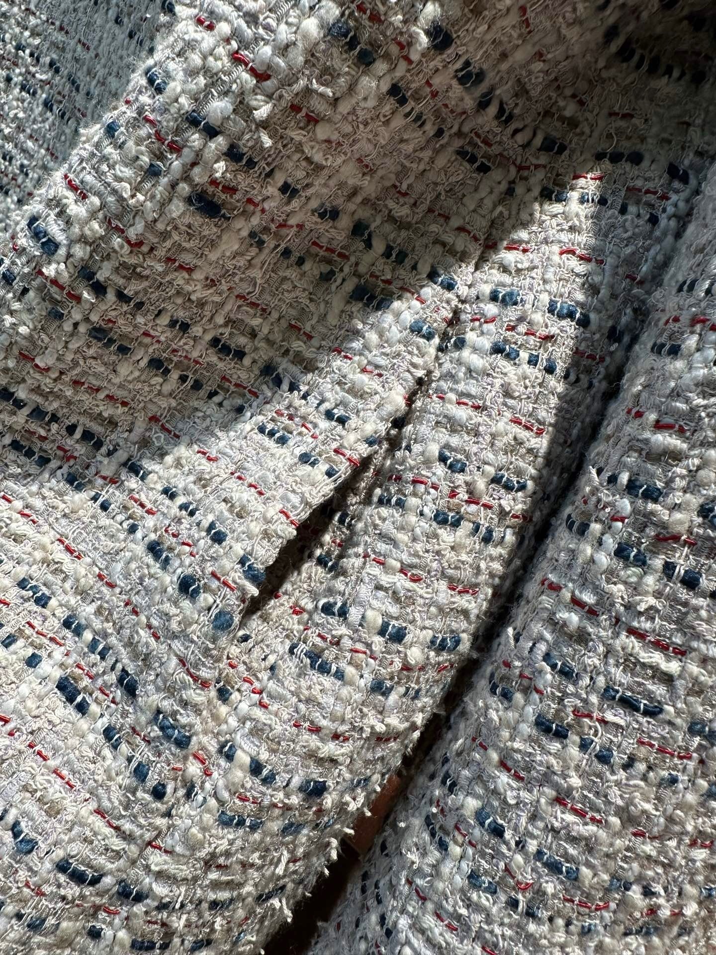 • Tissu Tweed Raffiné : Un magnifique tissage texturé qui mêle subtilement des fils de couleur crème, bleu pastel, rose et gris.