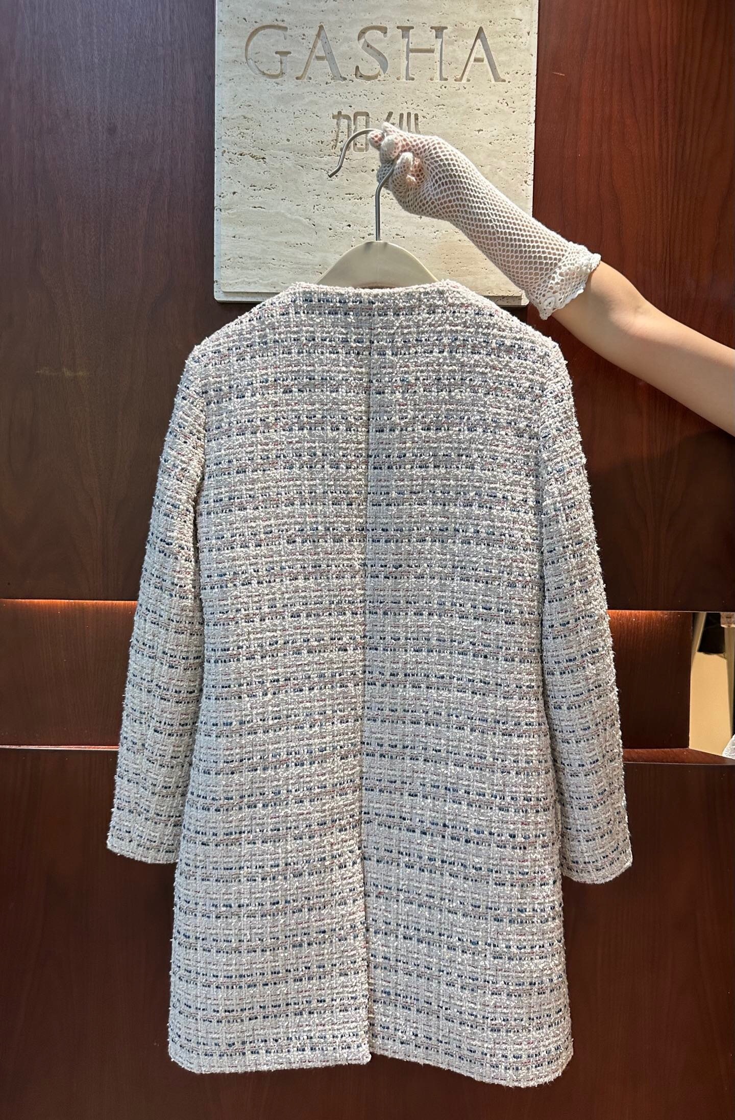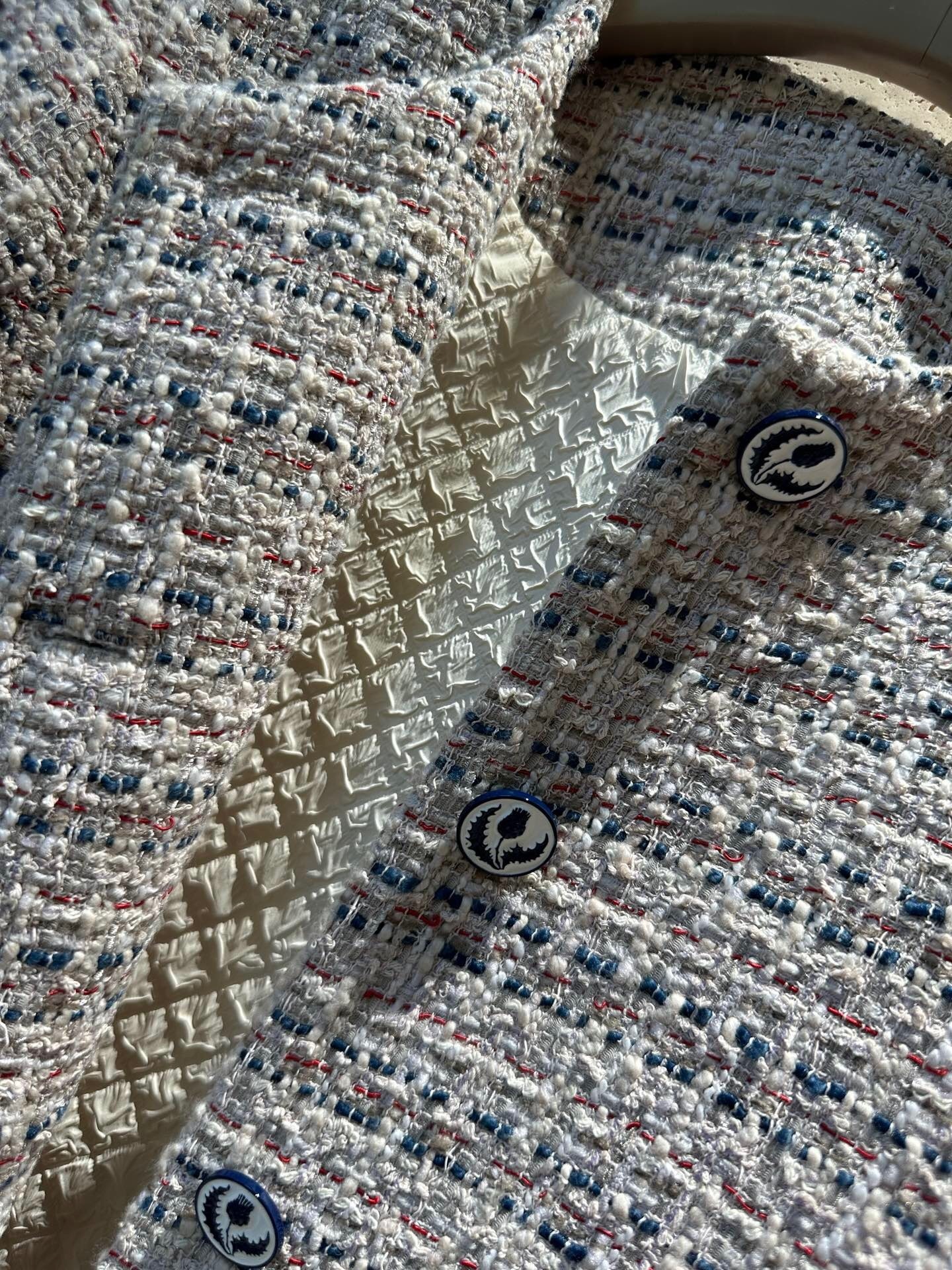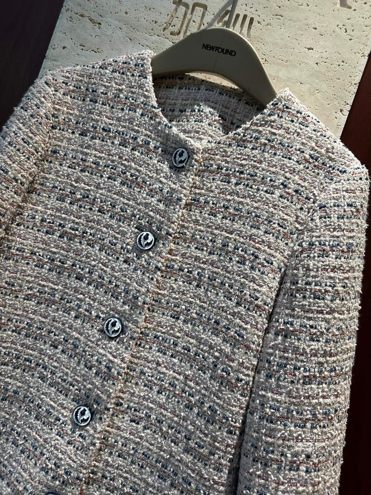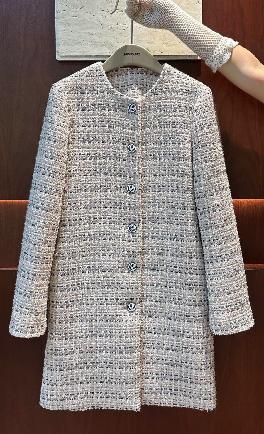 Une élégante veste longue style manteau en tweed. Tissu texturé multicolore (crème, bleu, rose), col rond épuré et boutons décoratifs. Parfaite pour la mi-saison.